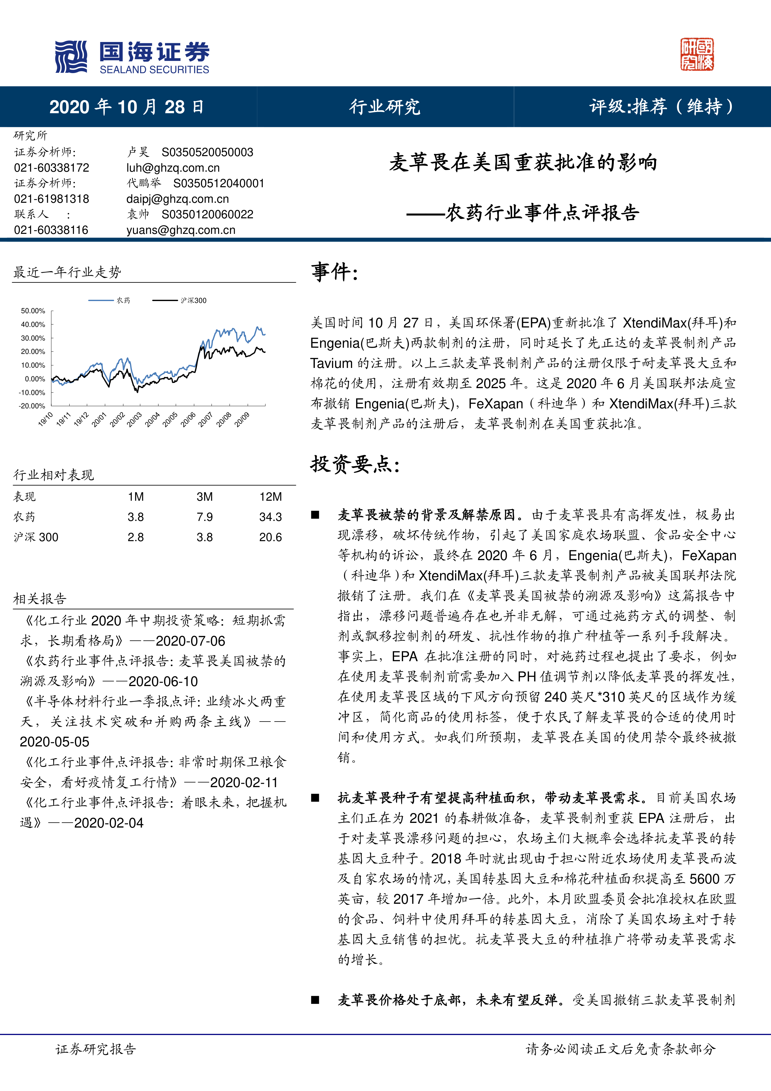 报告首先概述了美国环保署(EPA)重新批准三款麦草畏制剂注册的事件,并指出该事件发生在2020年10月27日,注册有效期至2025年。同时,报告还提供了最近一年农药行业及沪深300指数的走势图,显示农药行业表现强于沪深300指数。