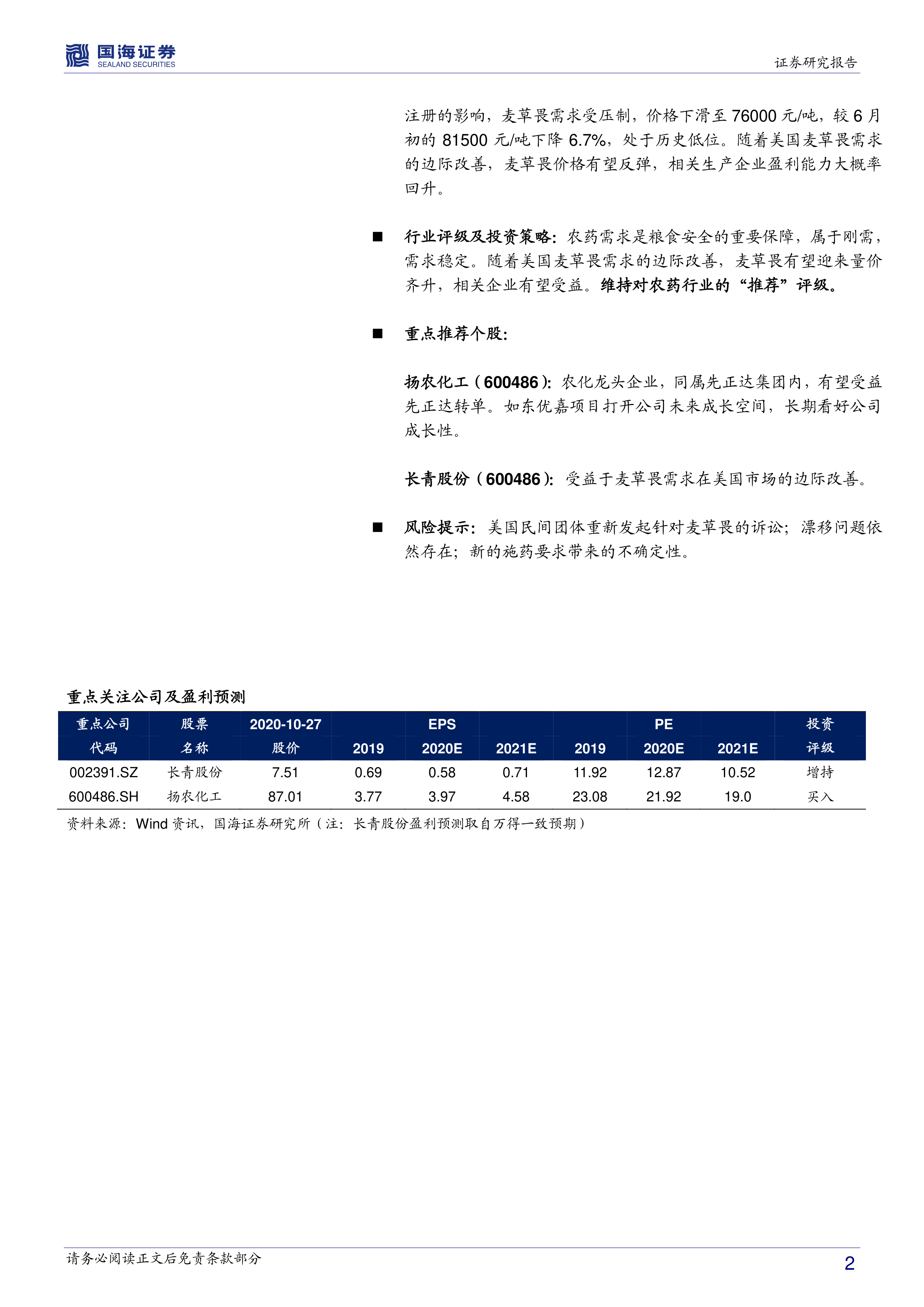 风险提示:美国民间团体重新发起针对麦草畏的诉讼;漂移问题依然存在;新的施药要求带来的不确定性。