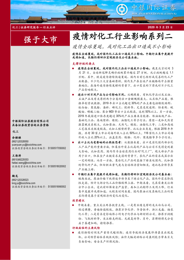 本报告基于全球新冠肺炎疫情的蔓延,对中国化工行业进行了深入的市场分析。报告指出,疫情对中国化工行业,特别是出口导向型企业和产品造成显著冲击,短期内化工产品价格上涨困难,行业集中度提升或将加速。长期来看,行业发展仍将依赖宏观经济和企业自身基本面。报告建议投资者关注业绩稳定的龙头企业和受疫情影响较小的细分领域,并提示了投资风险。 报告中大量使用了数据和图表,对疫情对化工行业的影响进行了量化分析,为投资者提供了有价值的参考信息。