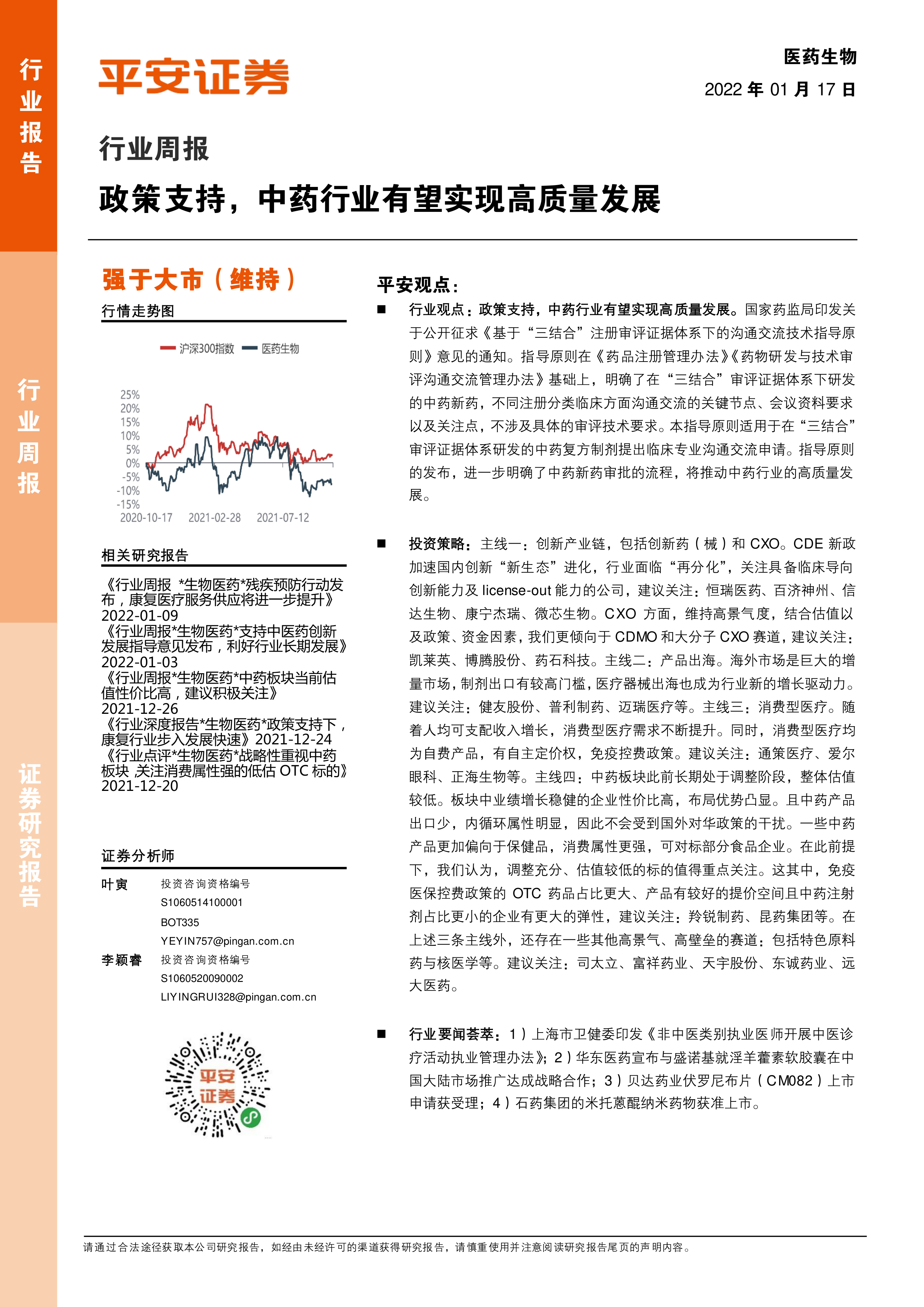 医药生物行业周报:政策支持,中药行业有望实现高质量发展