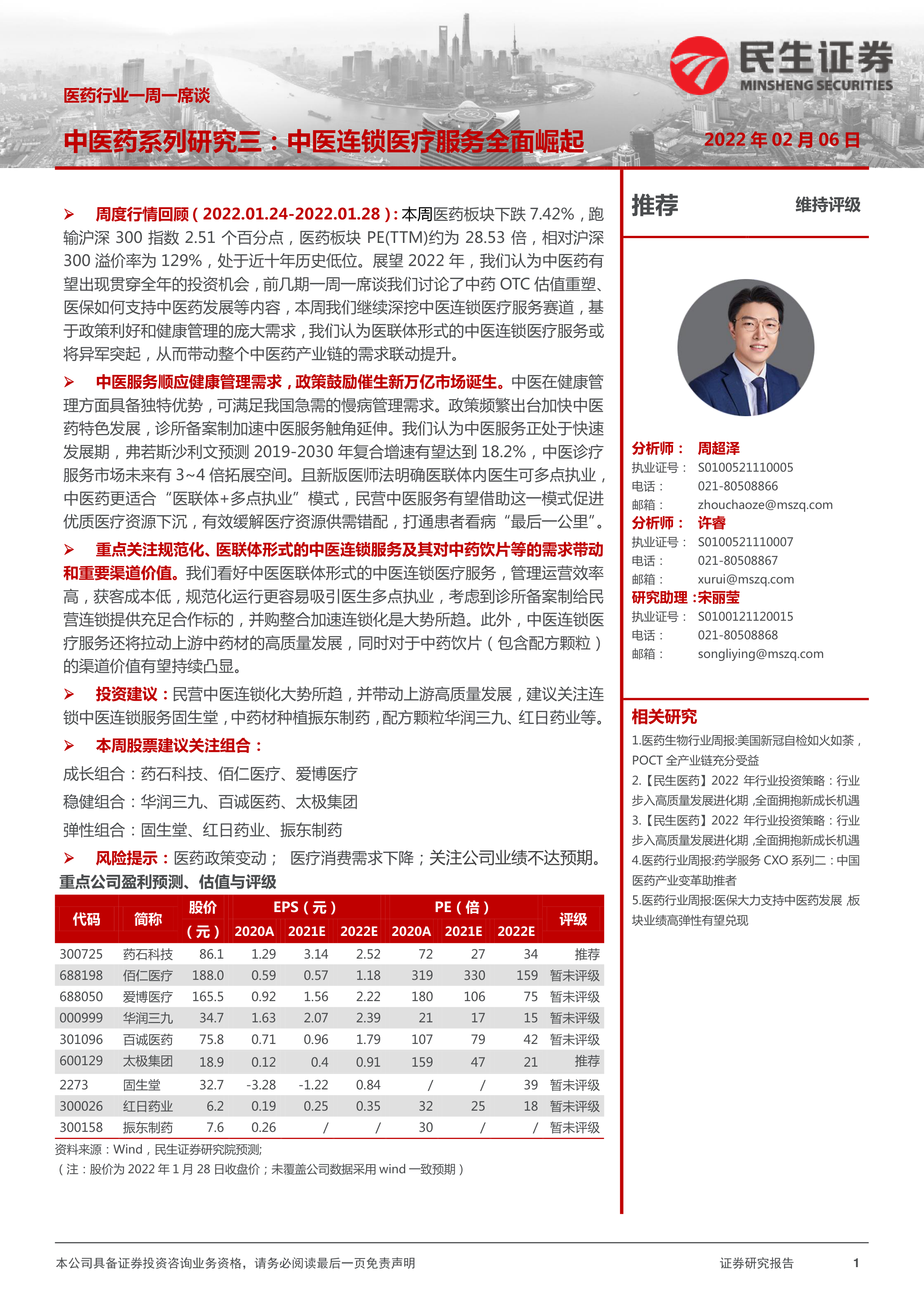 周度行情回顾(2022.01.24-2022.01.28):本周医药板块下跌7.42%,跑输沪深300指数2.51个百分点,医药板块PE(TTM)约为28.53倍,相对沪深300溢价率为129%,处于近十年历史低位。展望2022年,我们认为中医药有望出现贯穿全年的投资机会,前几期一周一席谈我们讨论了中药OTC估值重塑、医保如何支持中医药发展等内容,本周我们继续深挖中医连锁医疗服务赛道,基于政策利好和健康管理的庞大需求,我们认为医联体形式的中医连锁医疗服务或将异军突起,从而带动整个中医药产业链的需求联动提升。