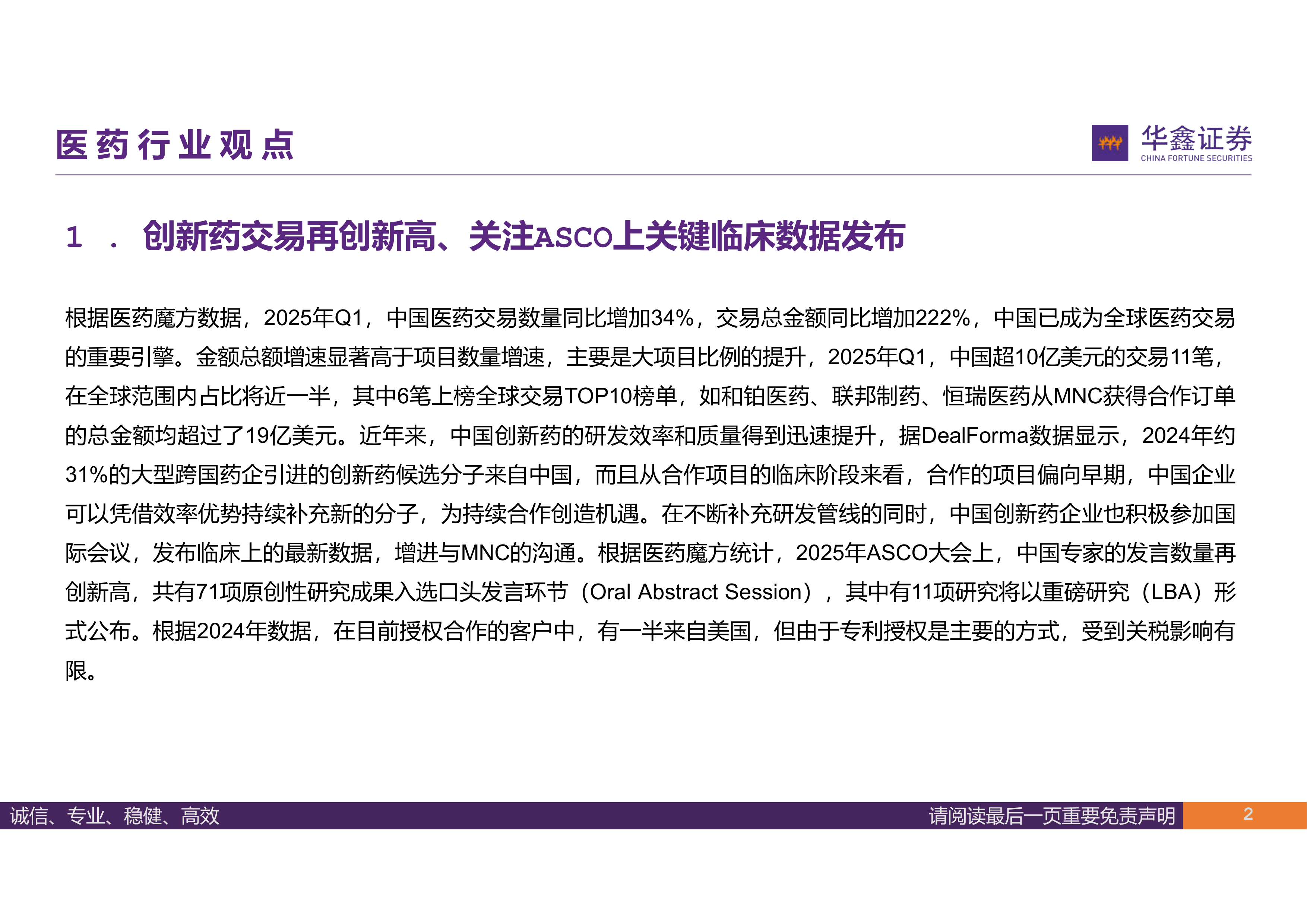 2025年第一季度,中国医药交易数量同比增长34%,交易总金额同比暴增222%,远超项目数量增速,显示出大项目交易比例的显著提升。中国已成为全球医药交易的重要引擎,超10亿美元交易额占比接近全球一半,其中6笔跻身全球TOP10。这表明中国创新药研发效率和质量的快速提升,吸引了众多跨国药企(MNC)的合作。DealForma数据显示,2024年约31%的大型跨国药企引进的创新药候选分子来自中国,且合作项目多集中于早期阶段,中国企业凭借效率优势持续补充新的分子,为长期合作创造机遇。 此外,中国专家在2025年ASCO大会上的发言数量再创新高,71项原创性研究成果入选口头发言环节,其中11项为重磅研究,进一步提升了中国创新药的国际影响力。