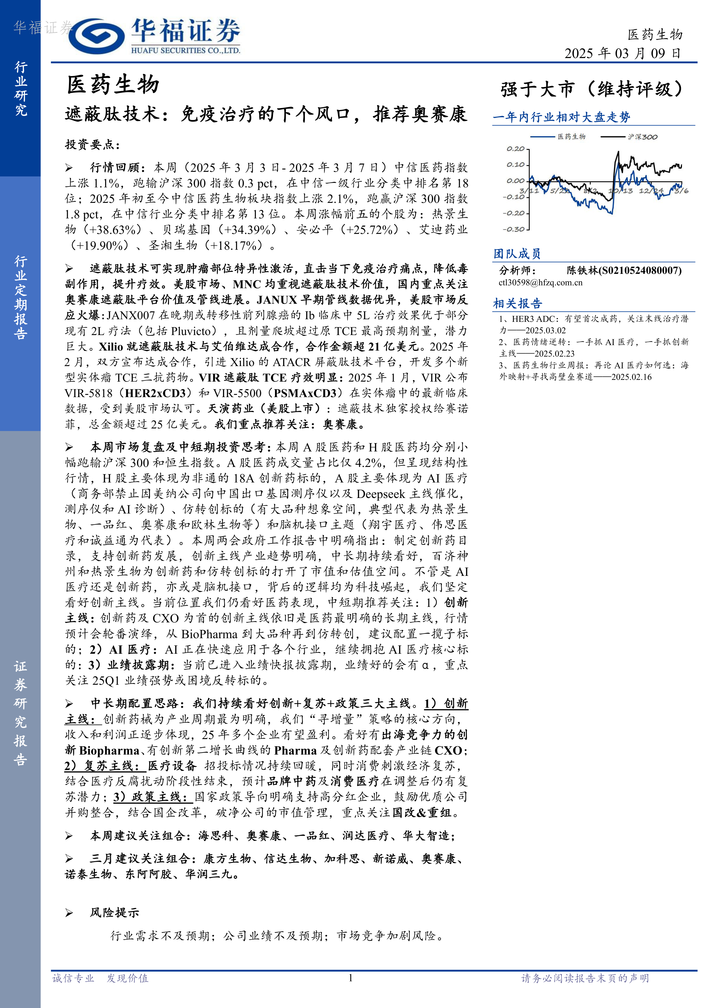 本报告的核心观点是:遮蔽肽技术有望成为免疫治疗的下一个风口,其特异性激活机制能够有效降低免疫治疗的毒副作用,提升疗效。美股市场和跨国药企均高度重视遮蔽肽技术的价值,国内市场潜力巨大,奥赛康作为国内重点关注标的,其遮蔽肽平台价值值得重估。此外,报告还分析了2025年3月3日至7日A股和H股医药市场行情,并对中长期投资策略进行了展望,推荐关注创新、复苏和政策三大主线。