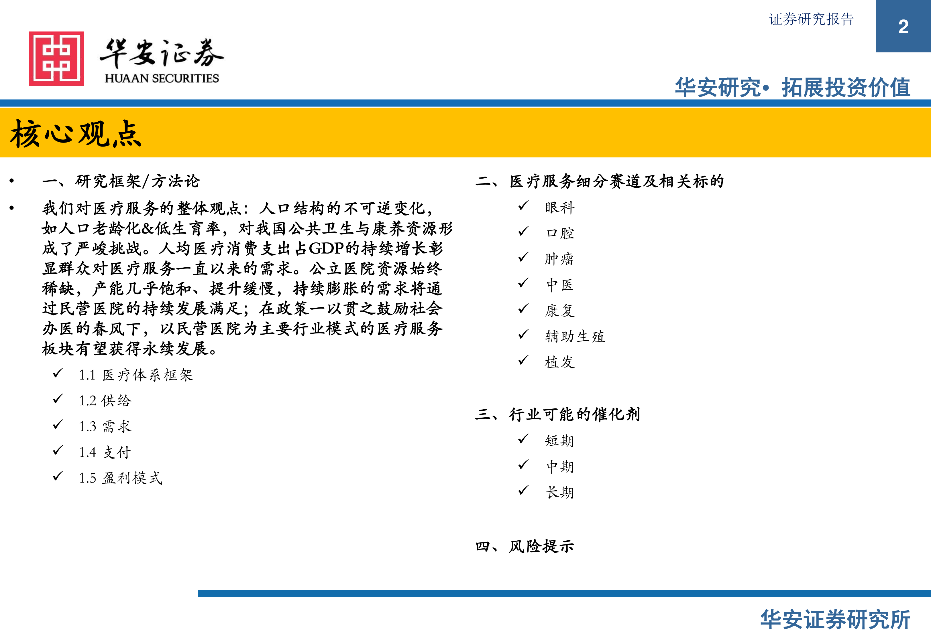 本报告的核心观点是:中国医疗服务行业正处于蓬勃发展时期,人口结构变化(老龄化和低生育率)、人均医疗消费支出持续增长以及国家政策的大力支持共同驱动了市场需求的持续膨胀。公立医院资源稀缺,产能饱和,民营医院将成为医疗服务的主要供给方,并在政策的持续支持下获得永续发展。报告重点分析了眼科、口腔、肿瘤、中医、康复、辅助生殖和植发七大细分赛道,并对部分龙头企业进行了深入研究,给出投资建议。
