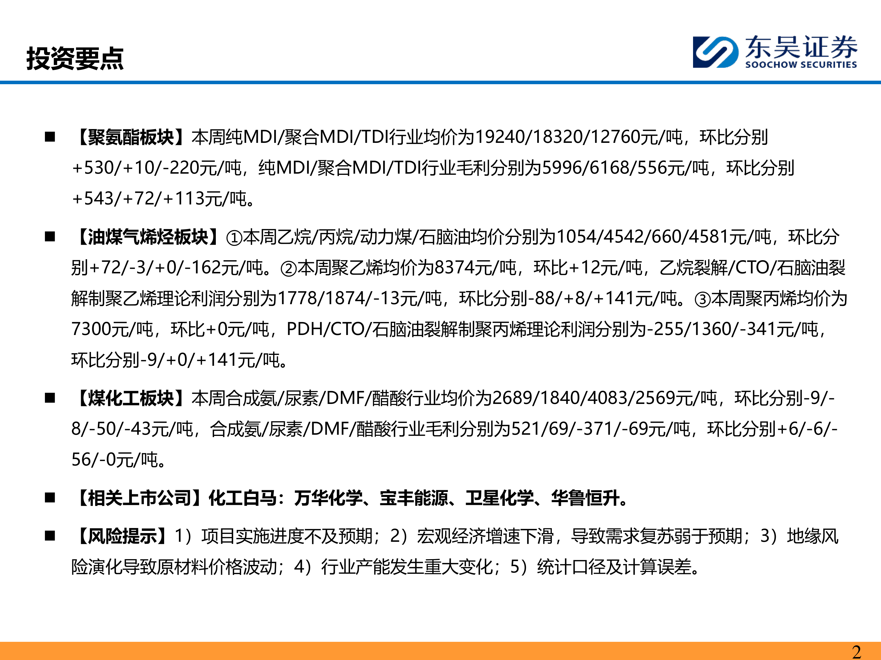 本报告的核心观点是:基础化工行业本周呈现分化态势。聚氨酯板块纯MDI价格大幅上涨,毛利显著提升;油煤气烯烃板块盈利能力波动较大,乙烷裂解制PE盈利下降,而CTO制聚丙烯盈利上升;煤化工板块整体表现疲软,多数产品价格和毛利均有所下降。
