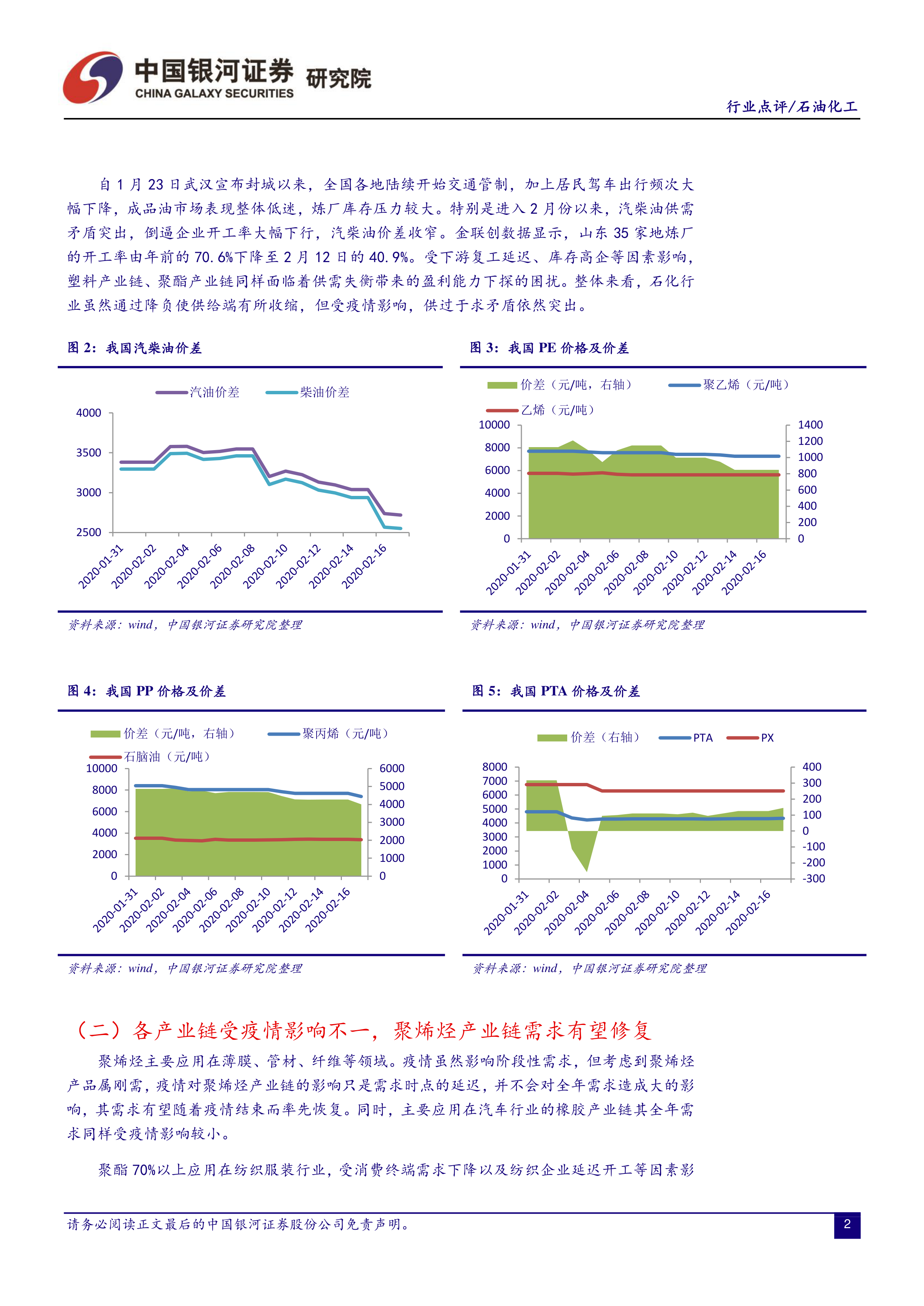 本报告的核心观点是:新冠疫情对中国石油化工行业造成冲击,导致油价下跌、供需失衡,行业盈利能力下降,加速了行业洗牌进程。但疫情影响各产业链不一,部分产业链需求有望修复,长期来看,龙头企业和具有竞争优势的细分领域仍具有投资价值。