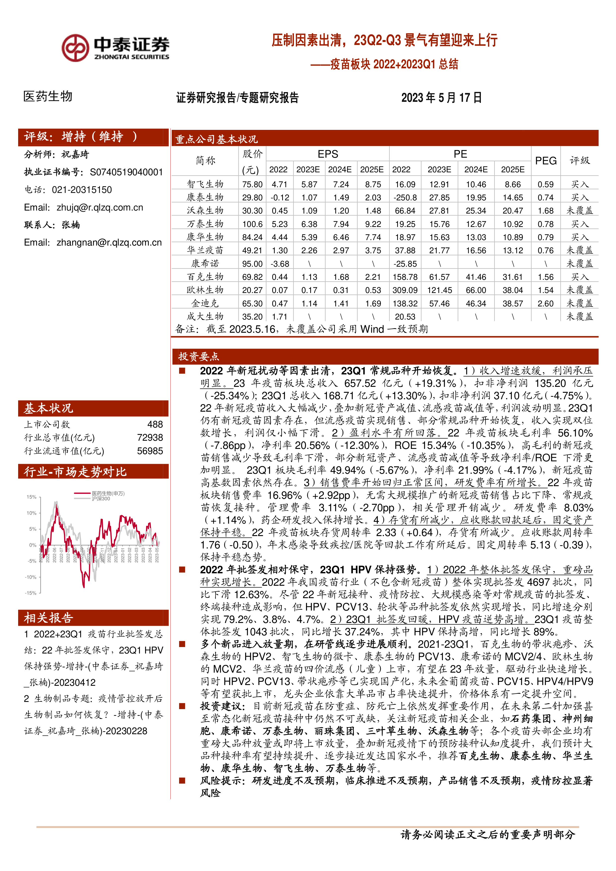 本报告主要从以下几个方面分析了2022年及2023年Q1疫苗板块的情况: