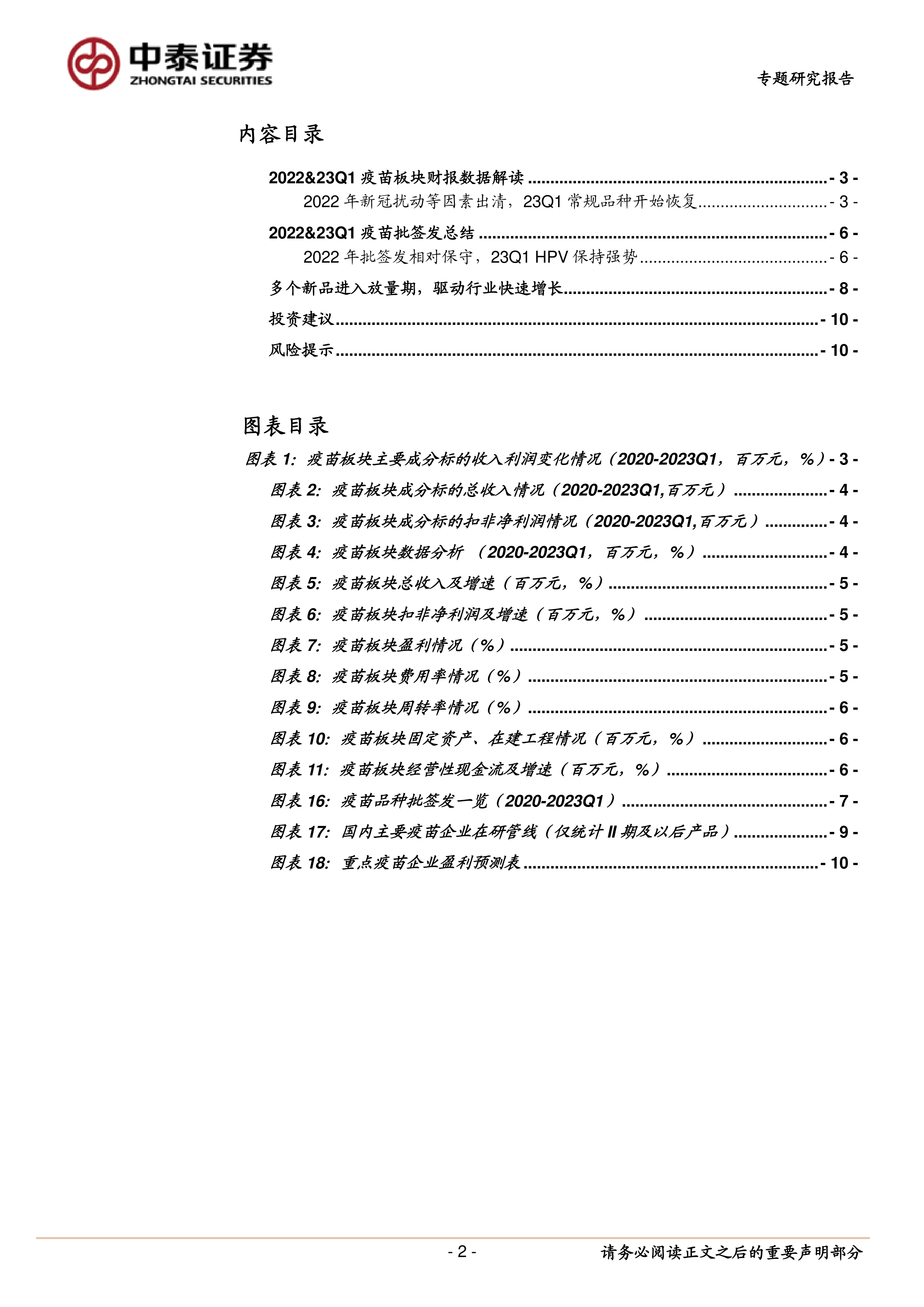 本报告的核心观点是:2022年,疫苗板块受到新冠疫情扰动等负面因素影响,盈利能力下降;但随着这些负面因素在2023年Q1逐渐消退,常规疫苗品种开始恢复,板块景气度有望在2023年Q2-Q3迎来上行。 报告重点关注了2022年及2023年Q1疫苗板块的财务数据、批签发情况以及新品放量情况,并据此提出投资建议。