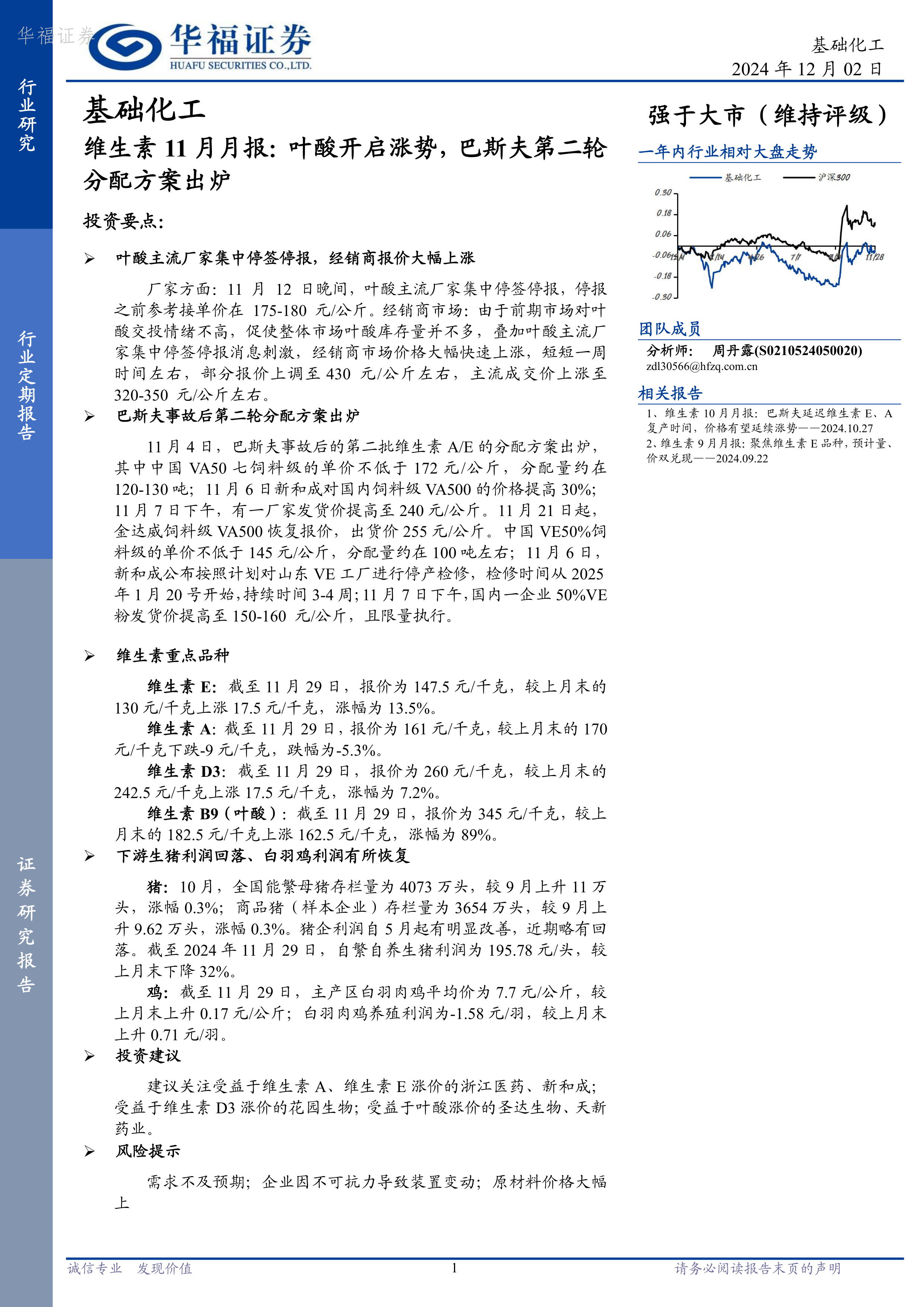 华福证券本报告对2024年11月份维生素市场进行了深入分析,数据显示叶酸价格大幅上涨,维生素A、E价格因巴斯夫事故及产能调整而波动,维生素D3价格也出现上涨。下游生猪养殖利润回落,白羽鸡养殖利润有所恢复。报告基于市场数据和分析,建议投资者关注受益于维生素价格上涨的相关上市公司,同时需注意市场风险。 报告提供了详细的价格数据、出口数据、生产装置情况以及下游需求分析,为投资者提供了全面的市场信息和投资参考。 然而,报告也指出,市场存在需求不及预期、不可抗力因素以及原材料价格波动等风险,投资者需谨慎决策。