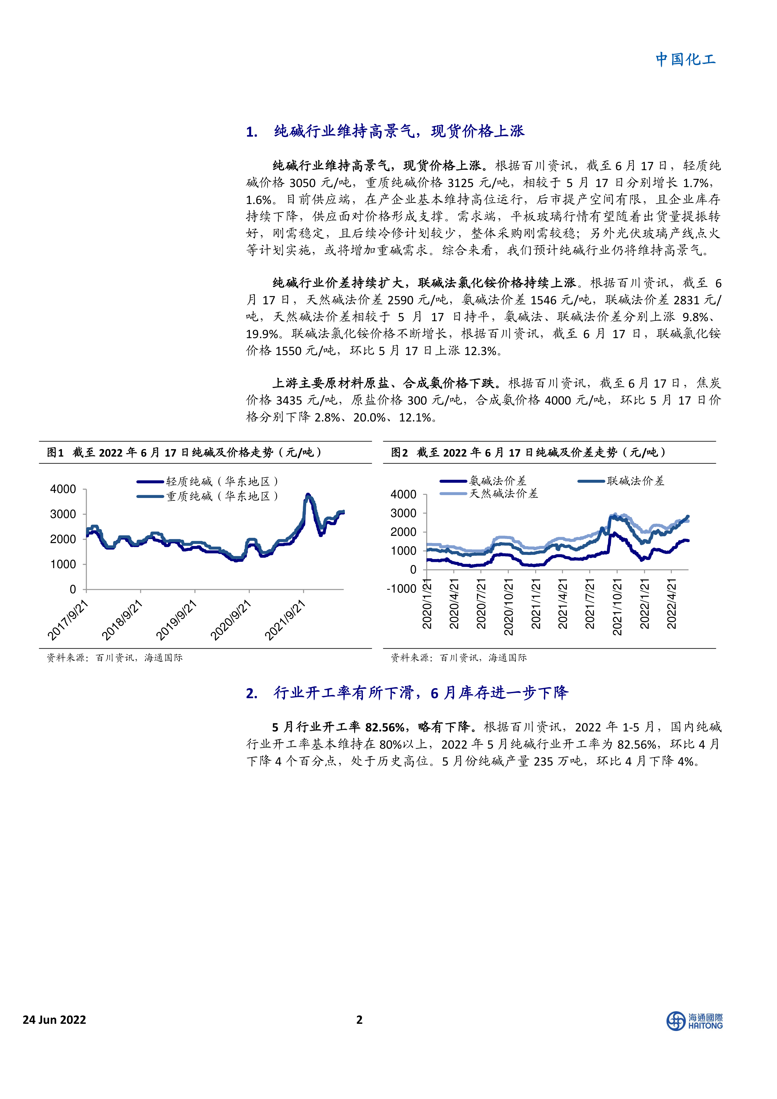 纯碱行业维持高景气,现货价格上涨。根据百川资讯,截至6月17日,轻质纯碱价格3050元/吨,重质纯碱价格3125元/吨,相较于5月17日分别增长1.7%,1.6%。纯碱行业价差持续扩大,联碱法氯化铵价格持续上涨。根据百川资讯,截至6月17日,天然碱法价差2590元/吨,氨碱法价差1546元/吨,联碱法价差2831元/吨,天然碱法价差相较于5月17日持平,氨碱法、联碱法价差分别上涨9.8%、19.9%。上游主要原材料原盐、合成氨价格下跌。目前供应端,在产企业基本维持高位运行,后市提产空间有限,且企业库存持续下降,供应面对价格形成支撑。需求端,平板玻璃行情有望随着出货量提振转好,刚需稳定,且后续冷修计划较少,整体采购刚需较稳;另外光伏玻璃产线点火等计划实施,或将增加重碱需求。综合来看,我们预计纯碱行业仍将维持高景气。