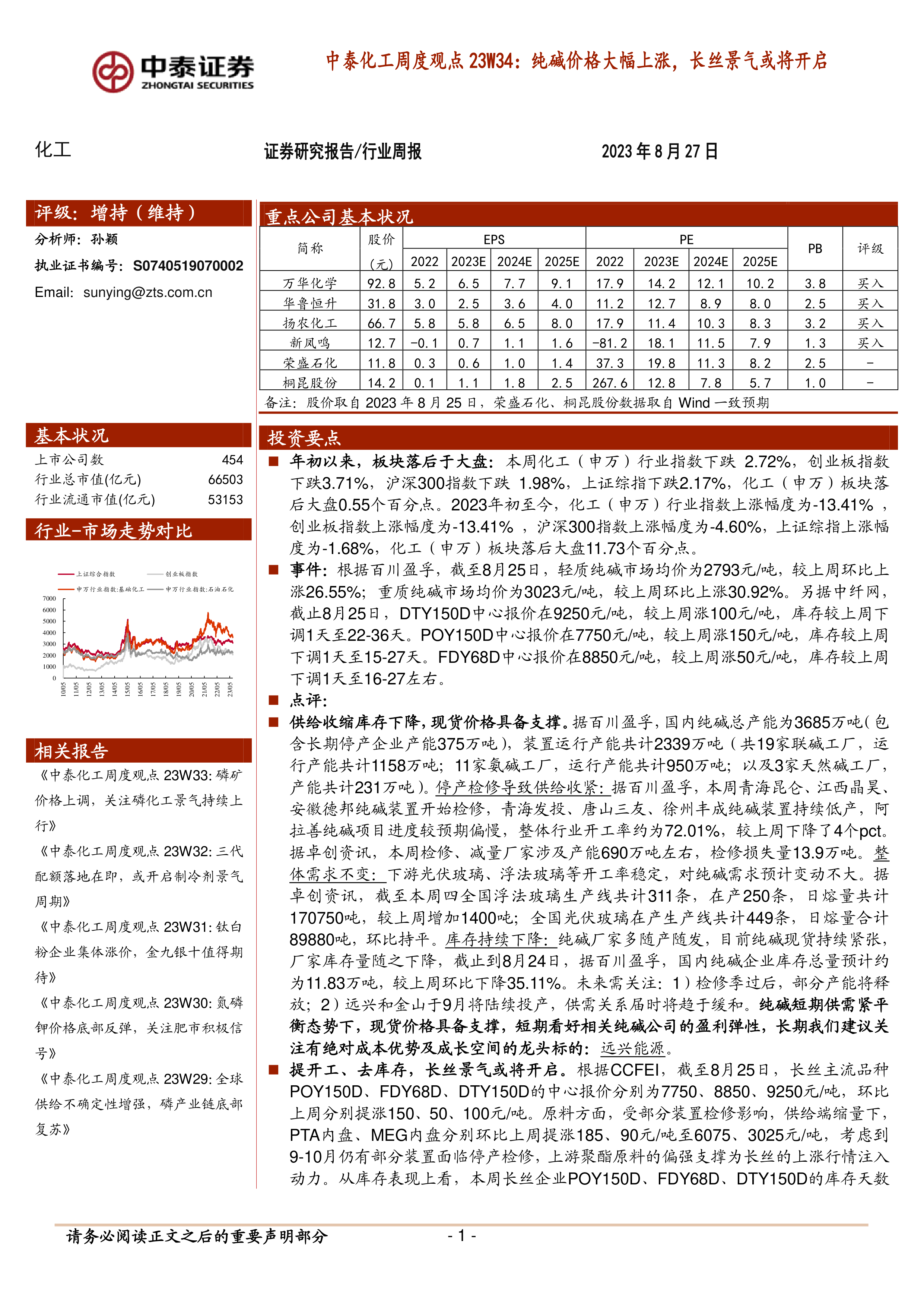 中泰化工周度观点23W34:纯碱价格大幅上涨,长丝景气或将开启