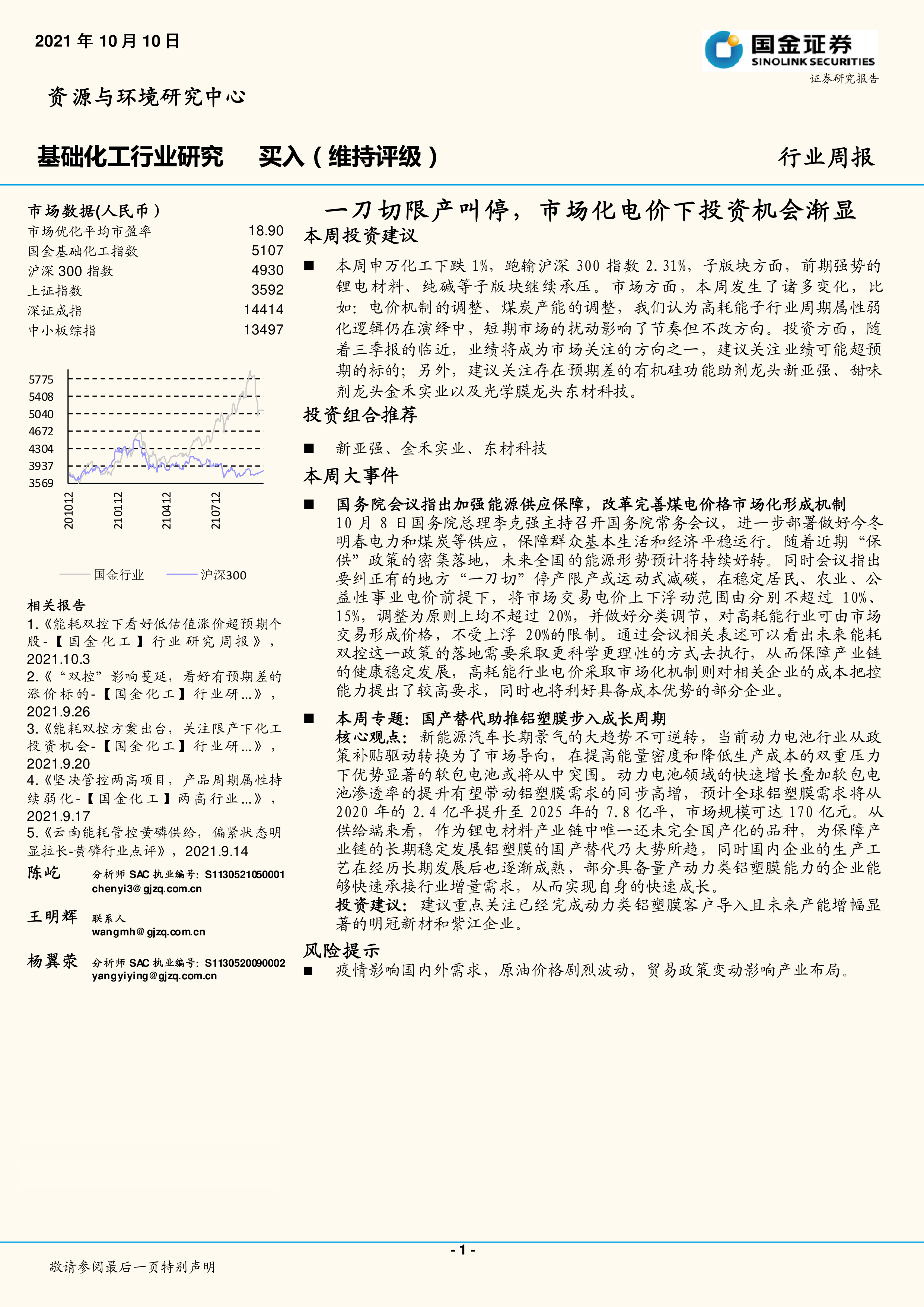 本报告的核心观点是:在“一刀切”限产叫停,以及煤电价格市场化改革的背景下,中国基础化工行业投资机会渐显。短期市场波动主要源于能源政策调整和市场情绪影响,但长期向好的发展趋势不变。建议关注业绩超预期标的以及存在预期差的龙头企业,例如有机硅功能助剂龙头新亚强、甜味剂龙头金禾实业以及光学膜龙头东材科技。此外,国产替代趋势下,铝塑膜行业也蕴藏着巨大的投资机会,建议关注明冠新材和紫江企业。