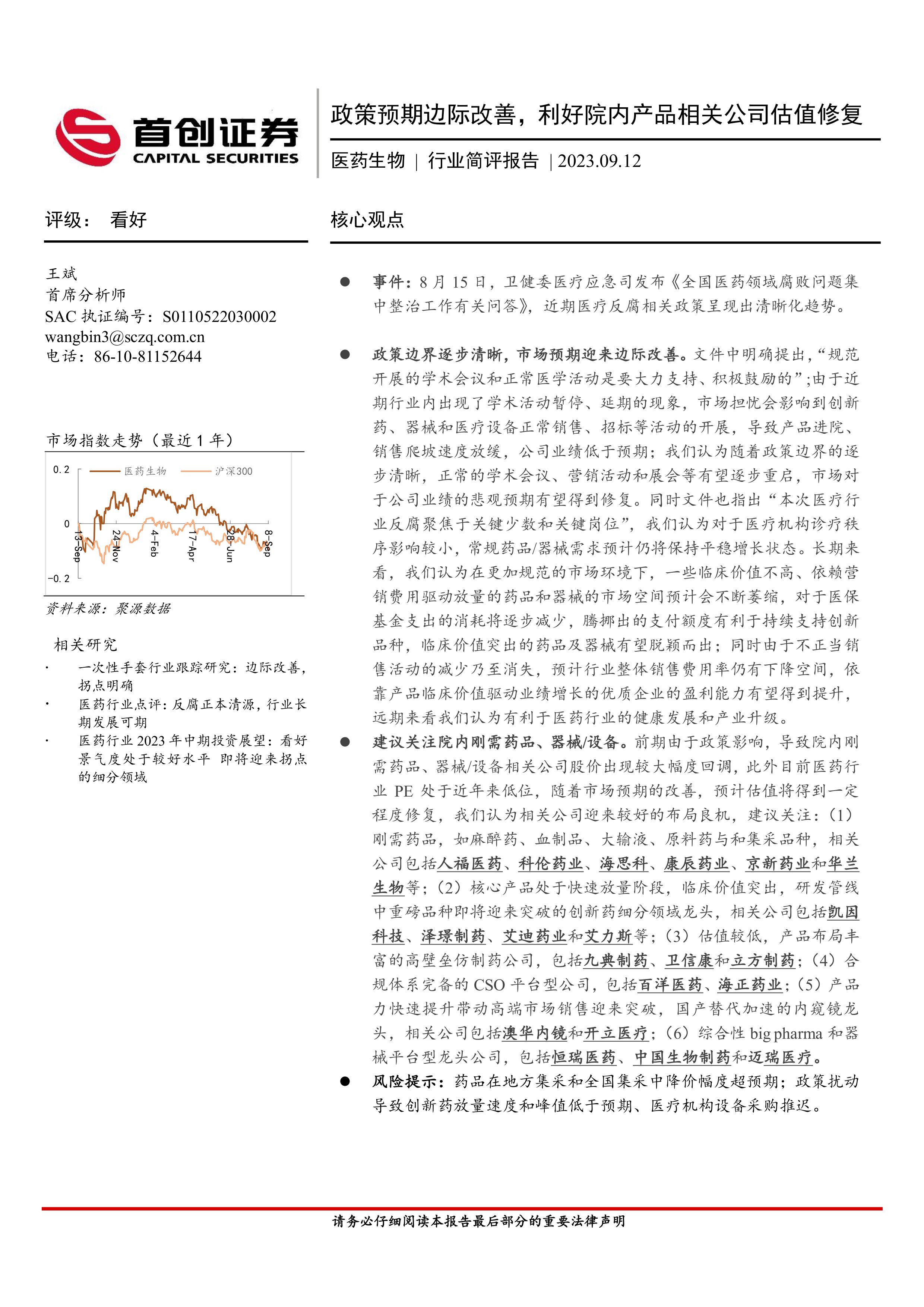 建议关注院内刚需药品、器械/设备。前期由于政策影响,导致院内刚需药品、器械/设备相关公司股价出现较大幅度回调,此外目前医药行业PE处于近年来低位,随着市场预期的改善,预计估值将得到一定程度修复,我们认为相关公司迎来较好的布局良机,建议关注:(1)刚需药品,如麻醉药、血制品、大输液、原料药与和集采品种,相关公司包括人福医药、科伦药业、海思科、康辰药业、京新药业和华兰生物等;(2)核心产品处于快速放量阶段,临床价值突出,研发管线中重磅品种即将迎来突破的创新药细分领域龙头,相关公司包括凯因科技、泽璟制药、艾迪药业和艾力斯等;(3)估值较低,产品布局丰富的高壁垒仿制药公司,包括九典制药、卫信康和立方制药;(4)合规体系完备的CSO平台型公司,包括百洋医药、海正药业;(5)产品力快速提升带动高端市场销售迎来突破,国产替代加速的内窥镜龙头,相关公司包括澳华内镜和开立医疗;(6)综合性bigpharma和器械平台型龙头公司,包括恒瑞医药、中国生物制药和迈瑞医疗。