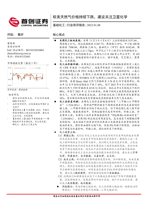 本报告的核心观点是:欧美暖冬导致天然气需求锐减,全球天然气价格持续下跌,这将对相关化工行业产生一定影响。同时,化工行业整体表现强劲,部分化工品价格上涨,部分价差扩大,建议关注化工龙头企业以及受益于地产行业边际改善的企业,特别是卫星化学。