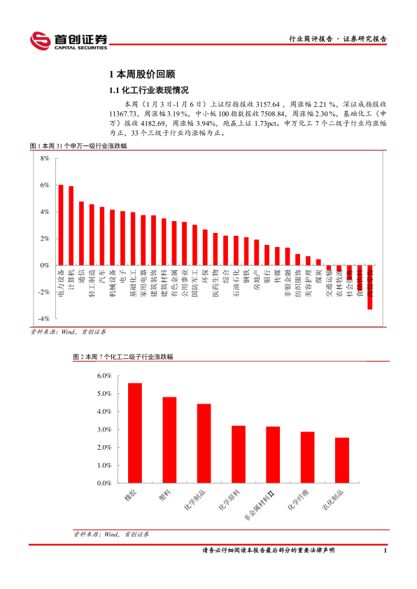 本周化工板块表现:本周(1月3日-1月6日)上证综指报收3157.64,周涨幅2.21%,深证成指报收11367.73,周涨幅3.19%,中小板100指数报收7508.84,周涨幅2.30%,基础化工(申万)报收4182.69,周涨幅3.94%,跑赢上证1.73pct。申万化工7个二级子行业均涨幅为正,33个三级子行业均涨幅为正。本周化工行业386家上市公司中,有345家涨幅为正。涨幅居前的个股有金三江、镇洋发展、艾艾精工、聚赛龙、泛亚微透。