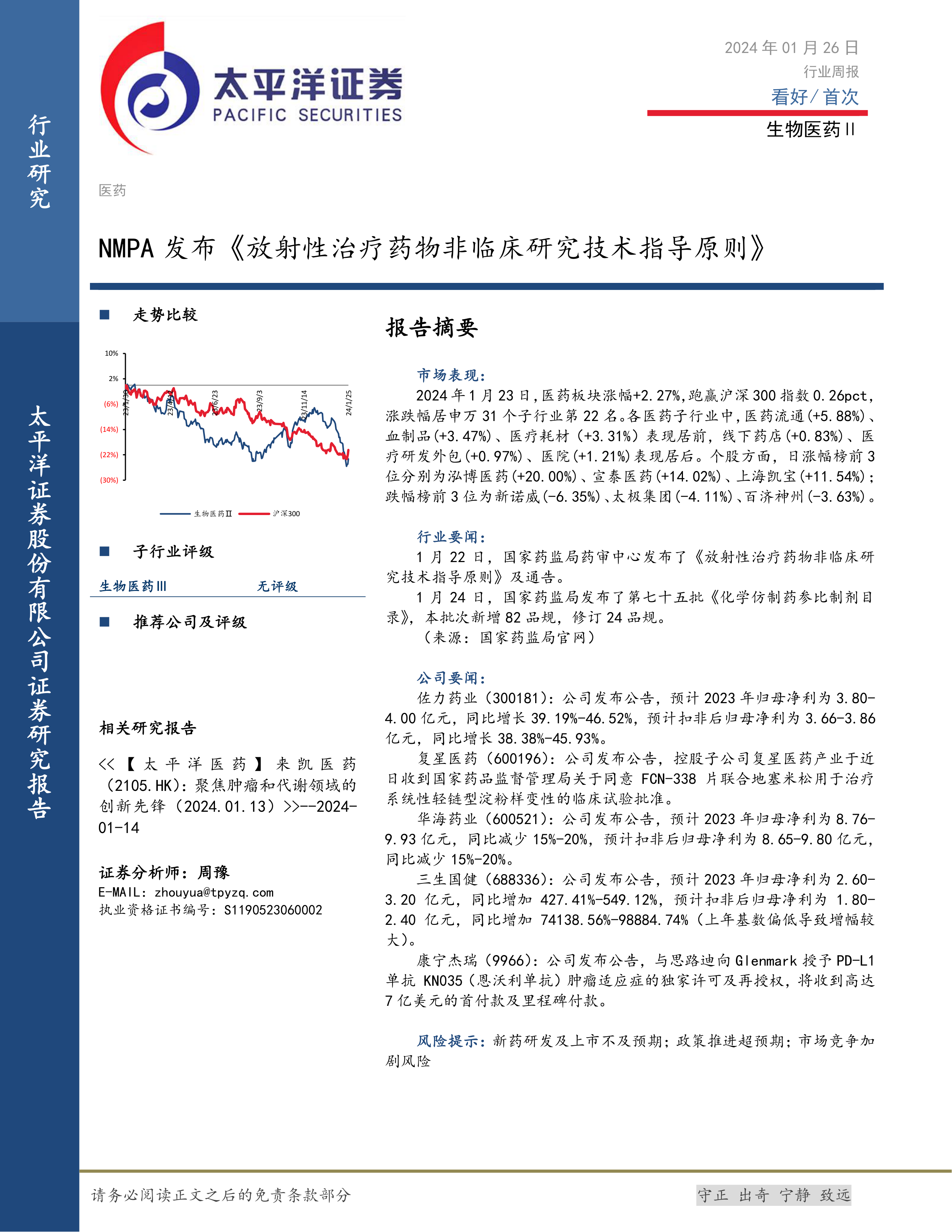 本报告的核心观点是:2024年1月26日,生物医药行业整体表现跑赢沪深300指数,部分子行业和个股涨幅显著,但也有部分个股出现下跌。国家药监局发布的政策文件对行业发展产生影响,部分上市公司发布了2023年业绩预告。