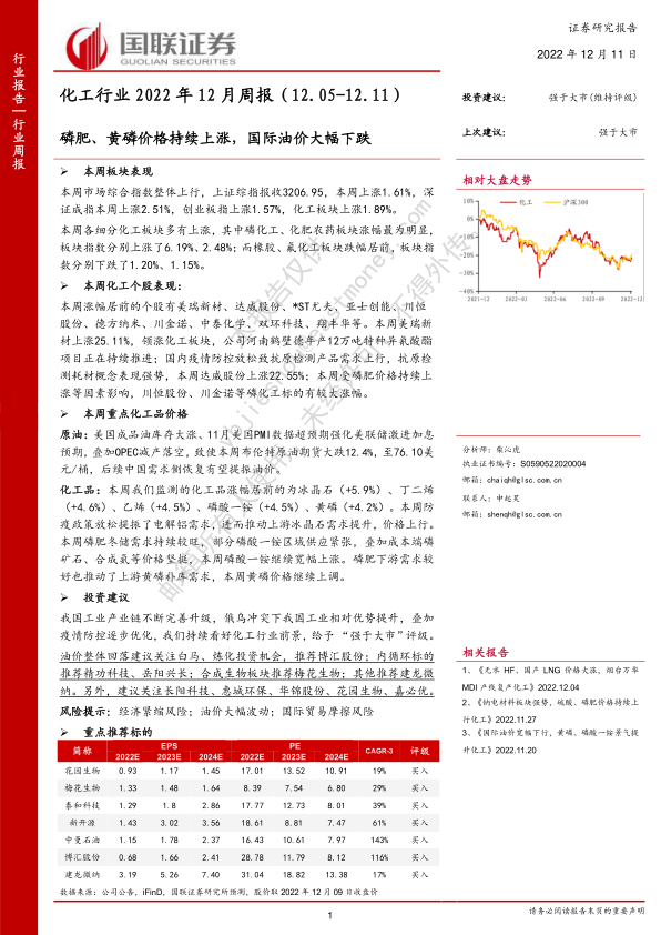 本报告对2022年12月5日至11日期间化工行业的表现进行了全面分析。 磷肥、黄磷价格上涨推动板块整体走强,但国际油价下跌也带来一定影响。 报告建议关注国产替代、内循环标的,低估值优质资产,以及受益于俄乌冲突和欧洲能源危机的标的,并提示了经济紧缩、油价波动和国际贸易摩擦等风险。 总体而言,报告对化工行业未来发展持乐观态度,并建议投资者关注相关投资机会。