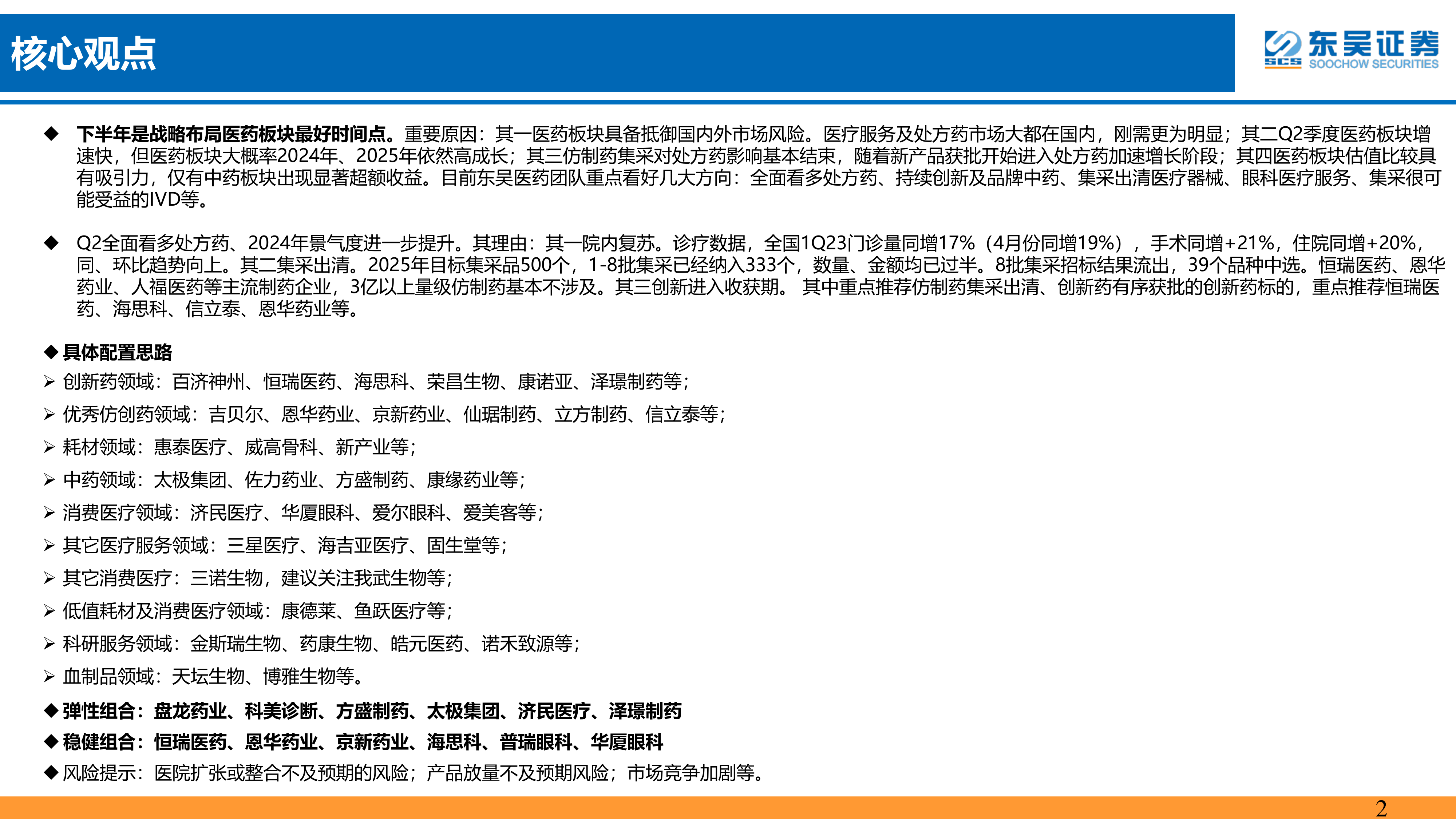 下半年是战略布局医药板块最好时间点。重要原因:其一医药板块具备抵御国内外市场风险。医疗服务及处方药市场大都在国内,刚需更为明显;其二Q2季度医药板块增速快,但医药板块大概率2024年、2025年依然高成长;其三仿制药集采对处方药影响基本结束,随着新产品获批开始进入处方药加速增长阶段;其四医药板块估值比较具有吸引力,仅有中药板块出现显著超额收益。目前东吴医药团队重点看好几大方向:全面看多处方药、持续创新及品牌中药、集采出清医疗器械、眼科医疗服务、集采很可能受益的IVD等。