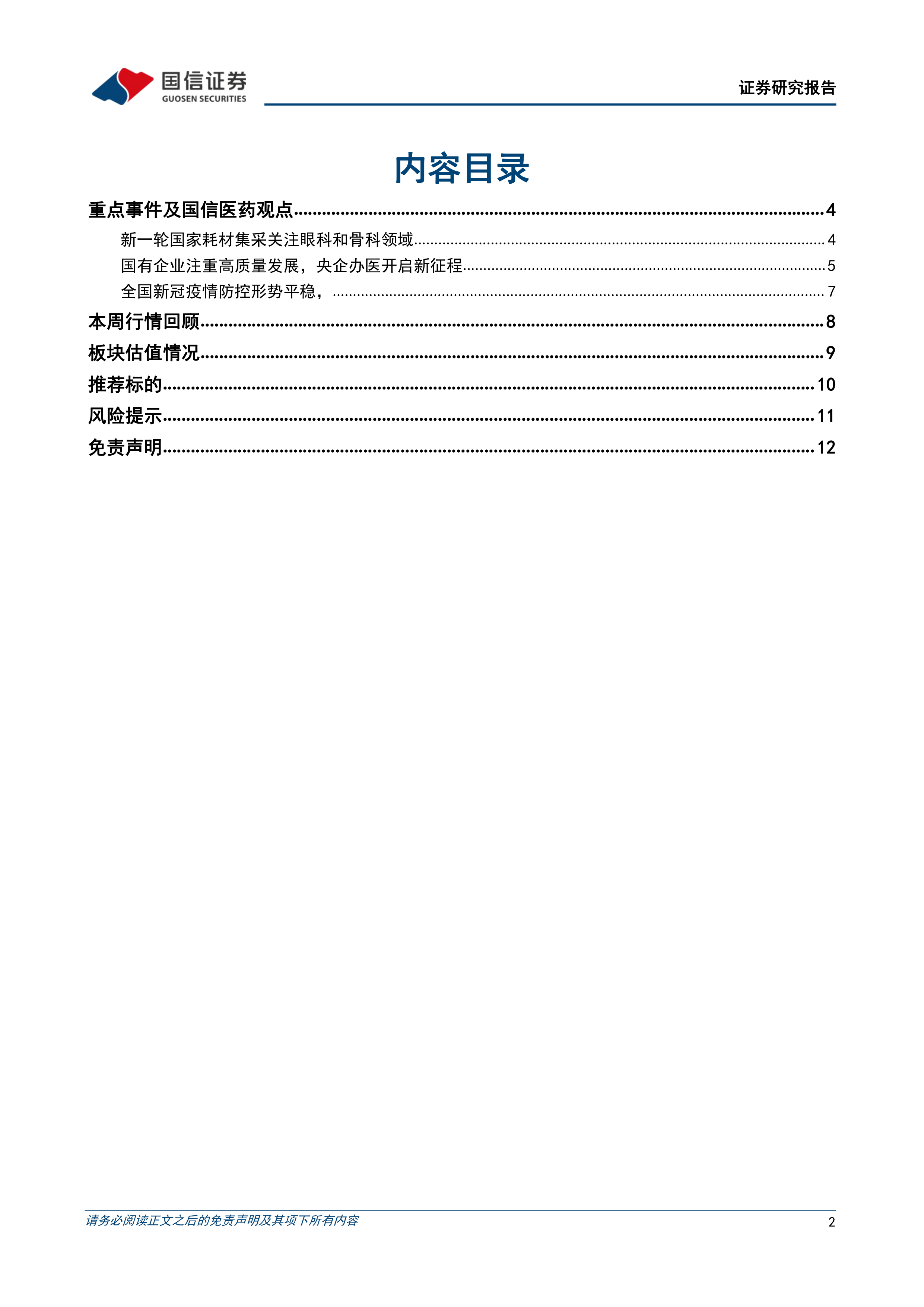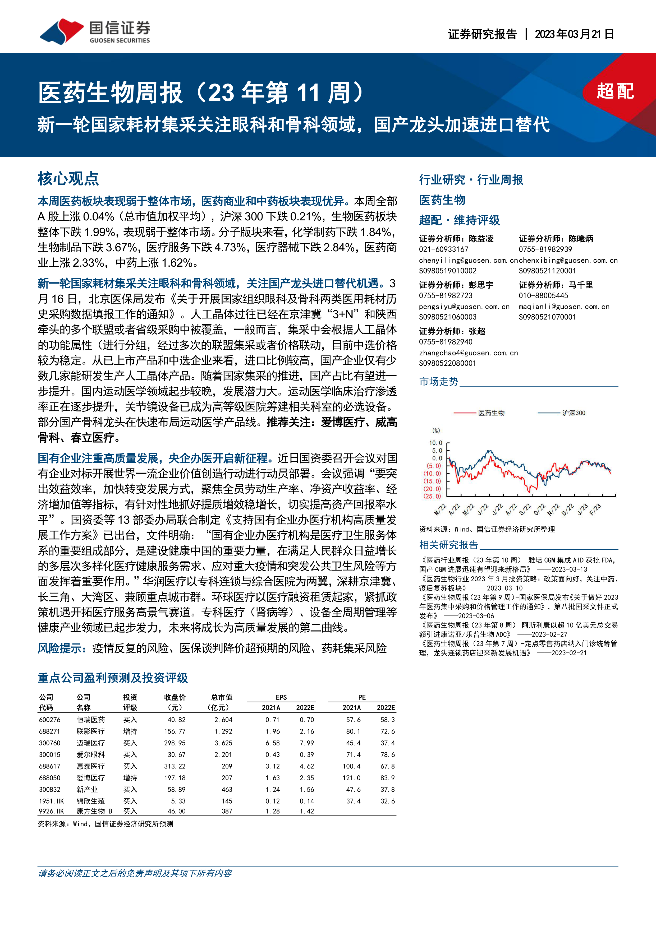 本报告分析了本周医药板块的市场表现,重点关注了新一轮国家耗材集采对眼科和骨科领域的影响,以及国有企业高质量发展和央企办医新征程带来的机遇。报告指出,国产医疗器械和医药企业将受益于集采和政策支持,并推荐了多只具有投资价值的股票,同时提示了相关投资风险。 报告数据主要来自Wind和国信证券经济研究所。