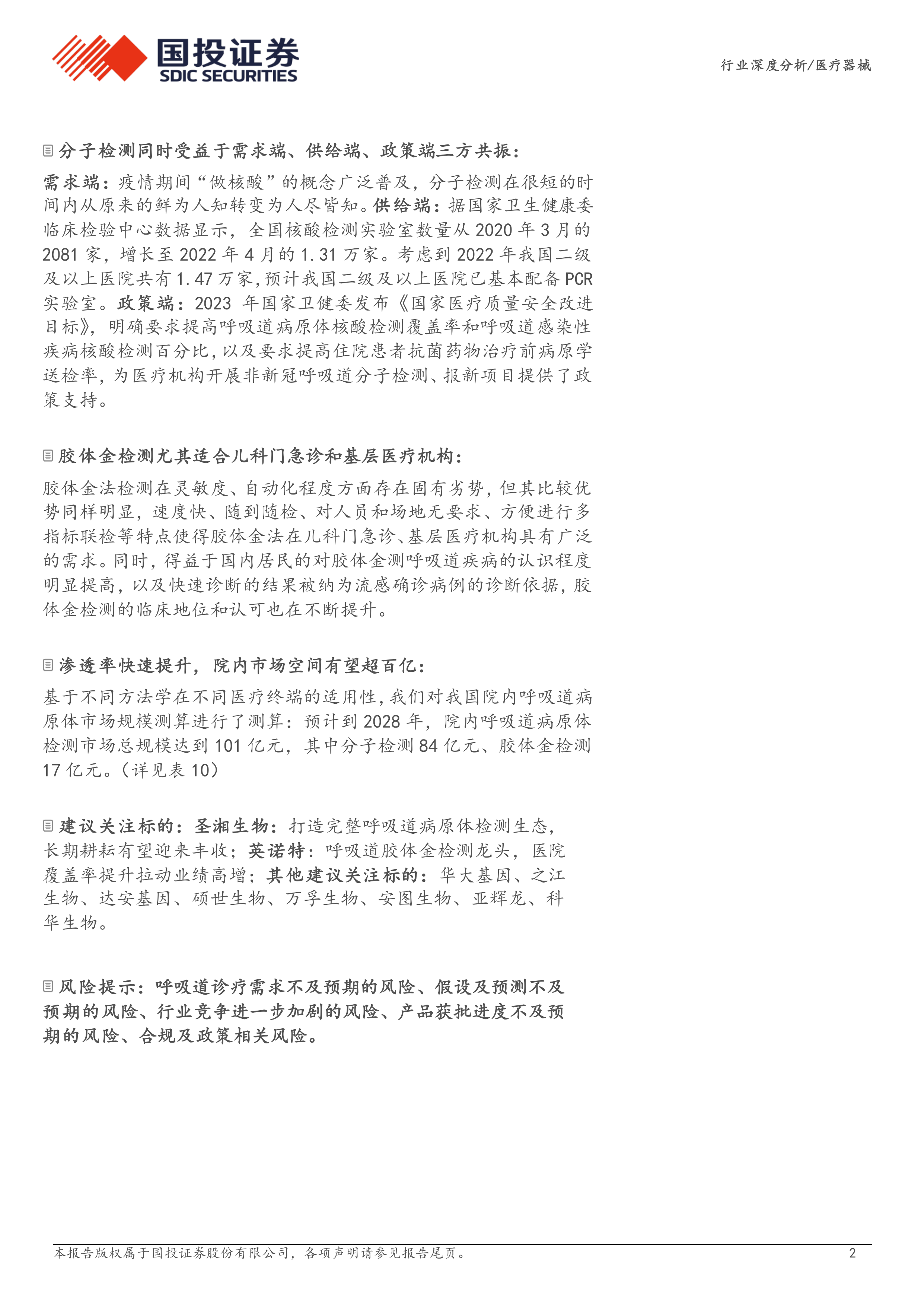 风险提示:呼吸道诊疗需求不及预期的风险、假设及预测不及预期的风险、行业竞争进一步加剧的风险、产品获批进度不及预期的风险、合规及政策相关风险。
