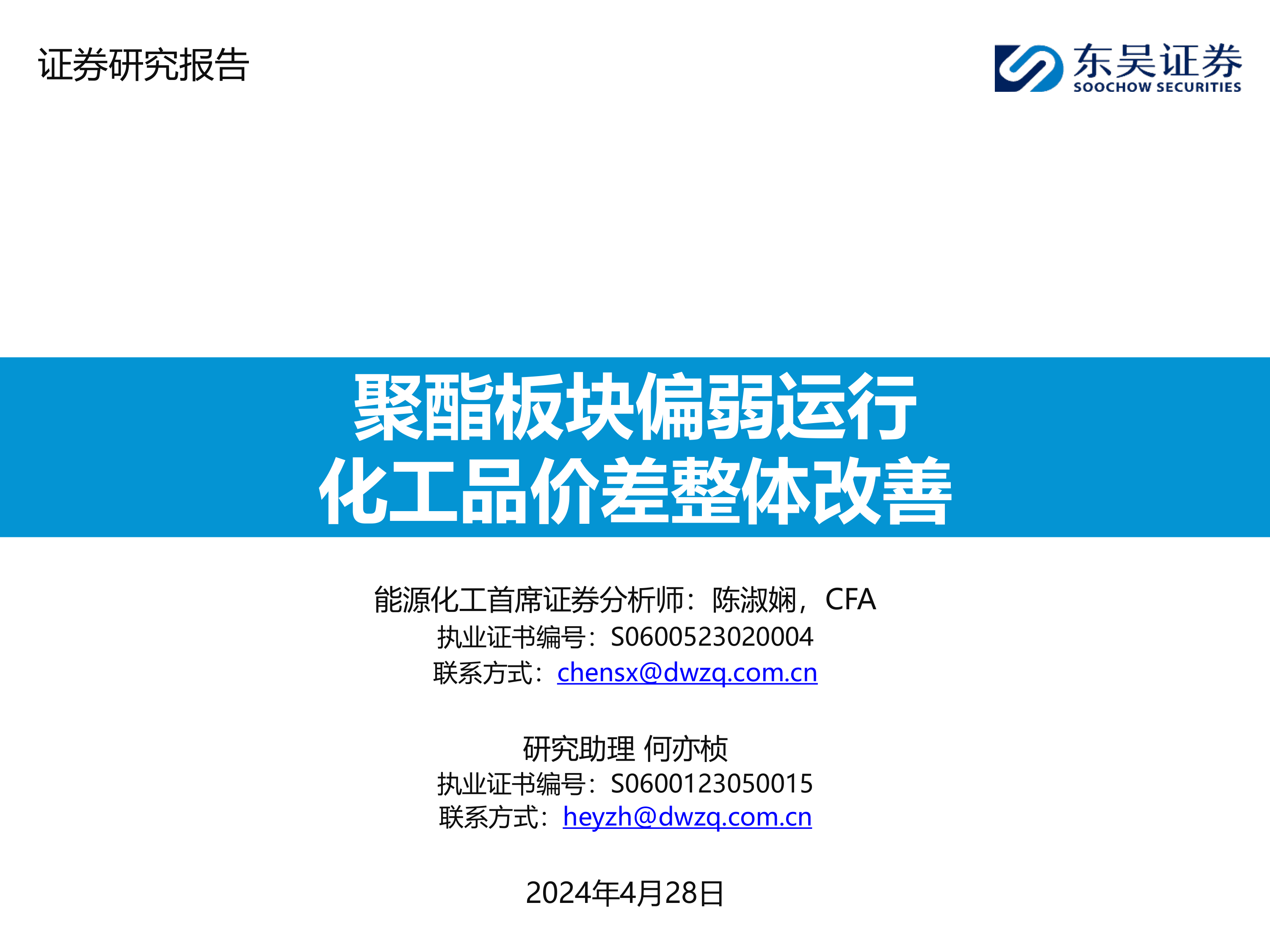 本报告对聚酯、炼油和化工品板块的市场运行情况进行了详细的统计分析,并提供了大量的数据和图表。报告指出,聚酯板块运行偏弱,炼油板块受国际油价下跌影响,化工品板块则呈现分化。报告最后列出了能源化工行业面临的主要风险,提醒投资者谨慎投资。 报告数据主要来源于Wind、Bloomberg和百川盈孚等权威数据机构,并结合东吴证券研究所的专业分析。 投资者应结合自身情况,谨慎参考报告内容进行投资决策。