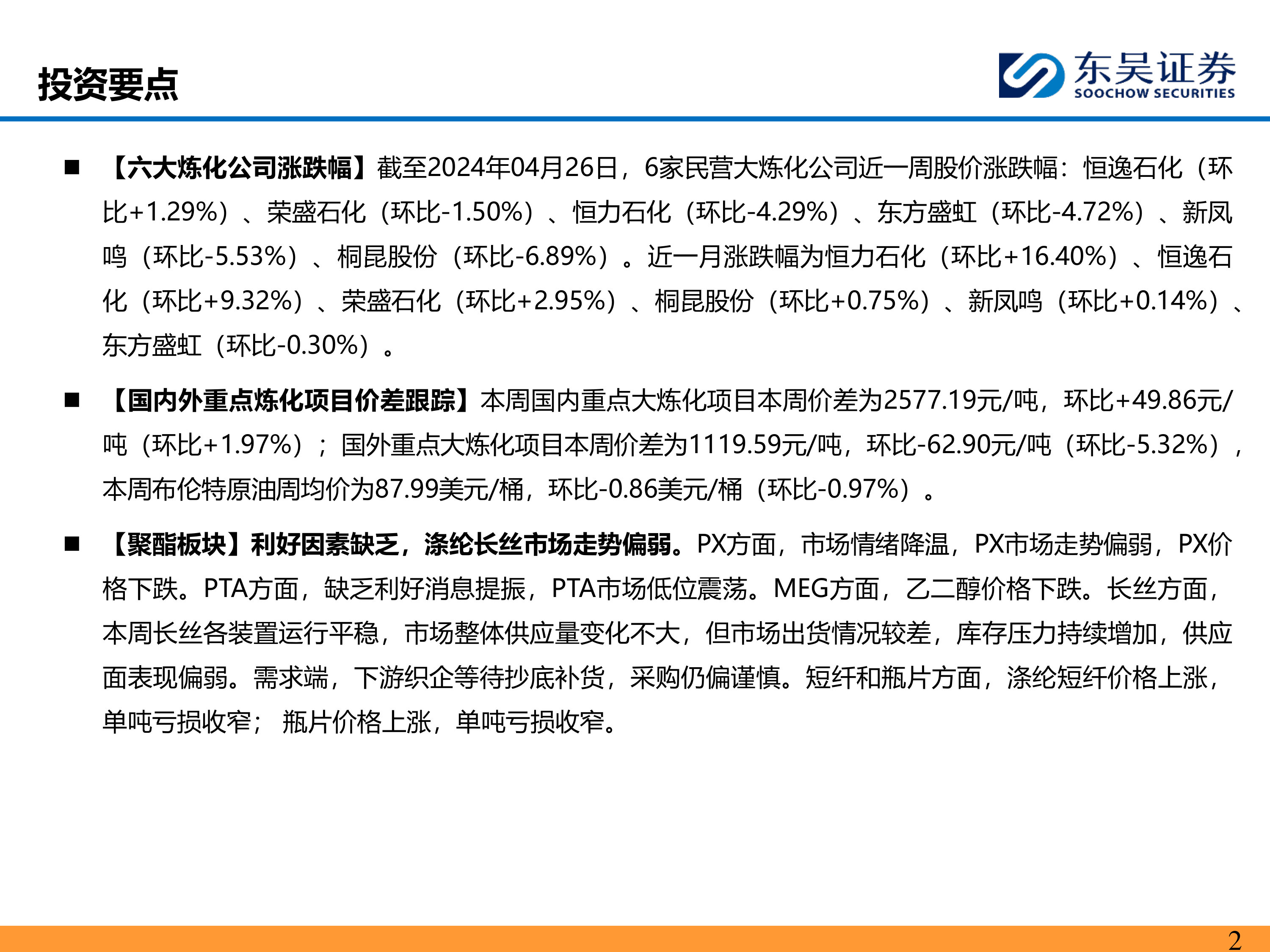 【风险提示】1)大炼化装置投产、达产进度不及预期。2)宏观经济增速严重下滑,导致需求端整体表现一般。3)地缘政治对油价出现大幅度的干扰。4)PX-PTA-PET产业链产能的重大变动。