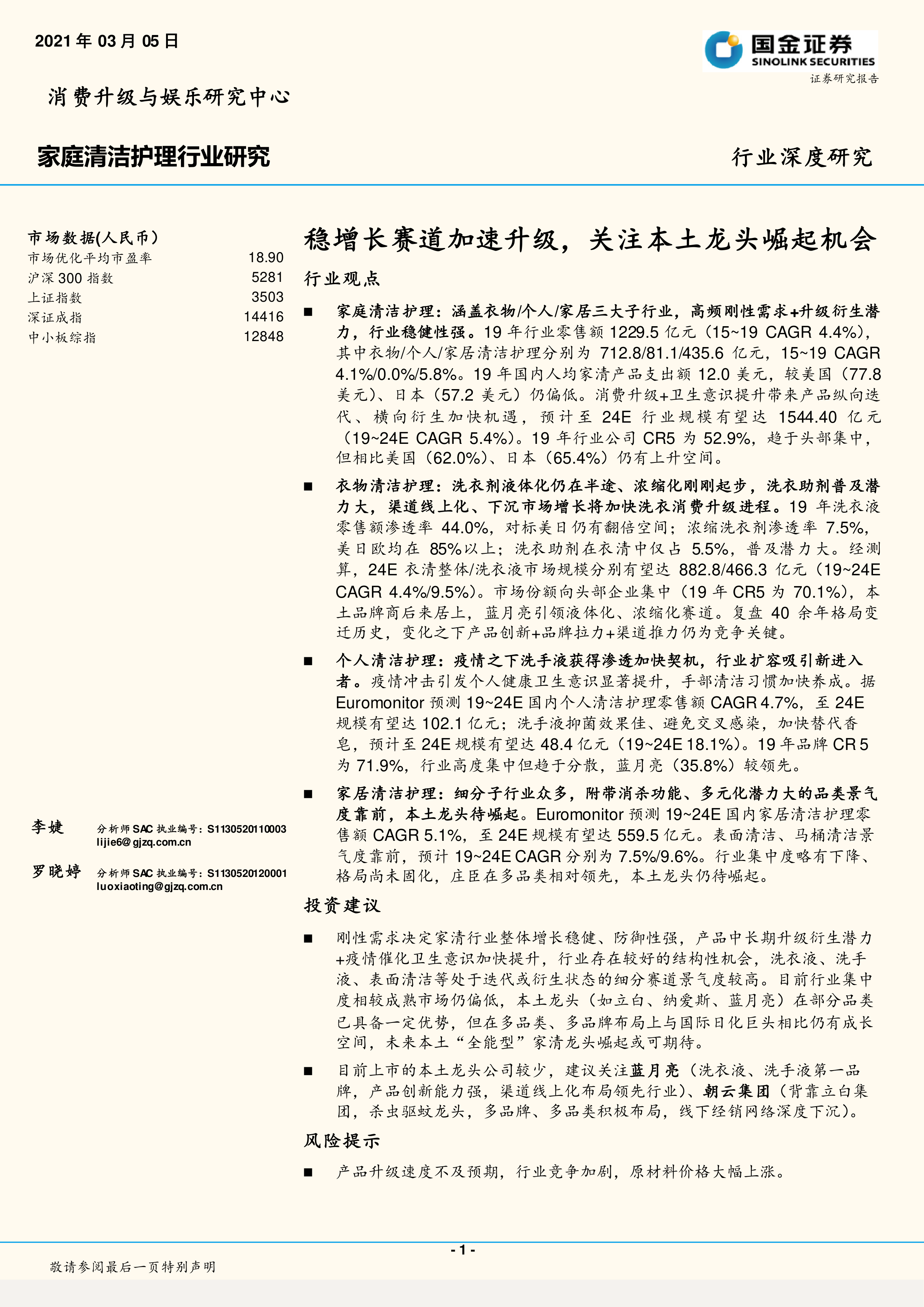 本报告的核心观点是:中国家庭清洁护理行业正经历稳健增长与消费升级并存的阶段,呈现出产品纵向迭代、横向衍生以及渠道线上化、下沉市场拓展的趋势。本土龙头企业在部分品类已具备优势,但与国际巨头相比仍有较大成长空间,未来有望崛起“全能型”家清龙头。