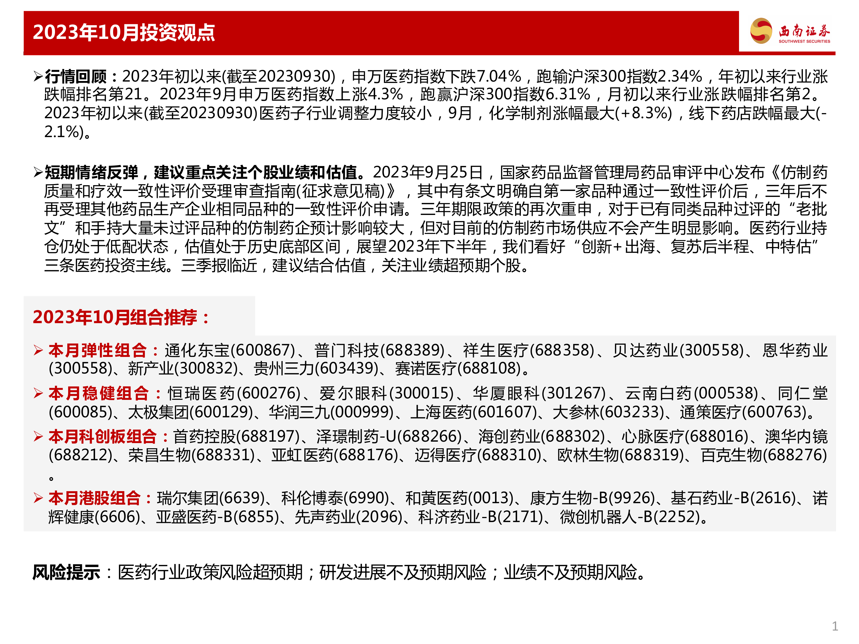 本报告的核心观点是:医药行业在2023年9月出现情绪反弹,申万医药指数上涨4.3%,跑赢沪深300指数6.31%。然而,年初至今行业整体表现仍相对疲软,下跌7.04%,跑输沪深300指数2.34%。短期情绪反弹主要受政策因素影响,长期来看,仍需关注个股业绩和估值。报告建议重点关注“创新+出海、复苏后半程、中特估”三条投资主线,并推荐了相应的弹性组合、稳健组合、科创板组合和港股组合。