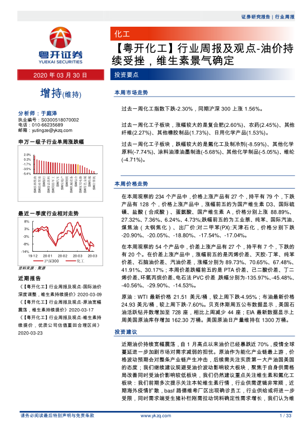 【粤开化工】行业周报及观点:油价持续受挫,维生素景气确定