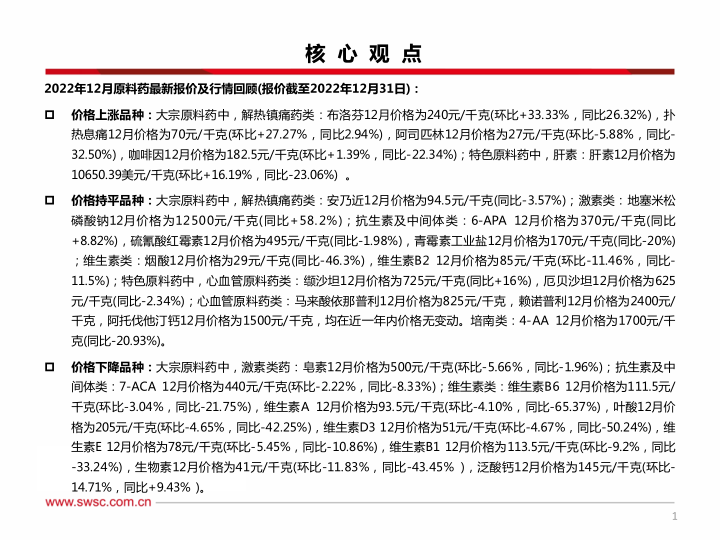 本报告的核心观点是:2022年12月,布洛芬和扑热息痛原料药价格环比大幅上涨,分别增长33.33%和27.27%,体现了医药原料药市场价格波动剧烈,并受到多种因素影响。报告分析了多种原料药的价格变化,并从短期和长期两个维度提出了投资建议。