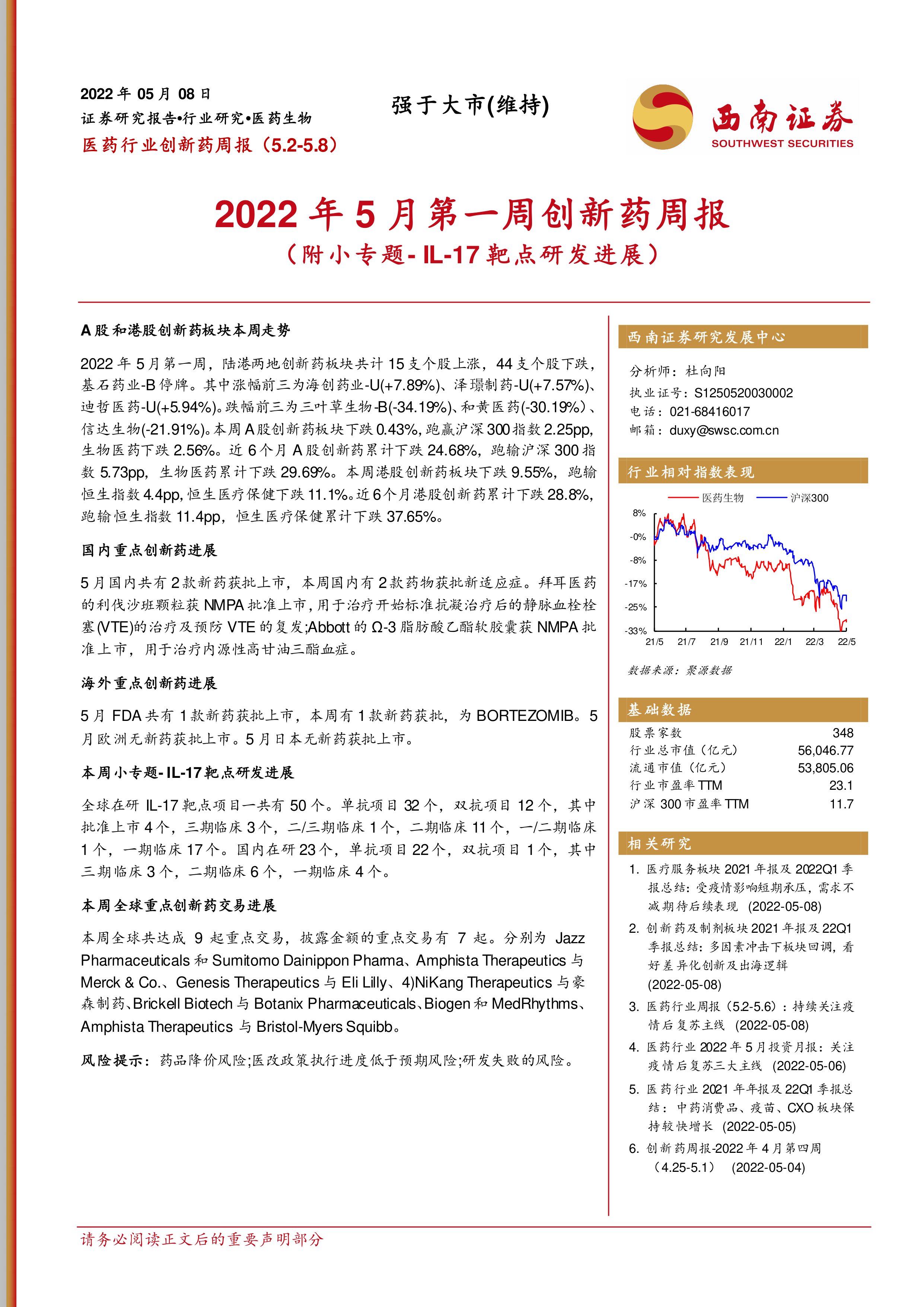 2022年5月第一周创新药周报(附小专题-IL-17靶点研发进展)