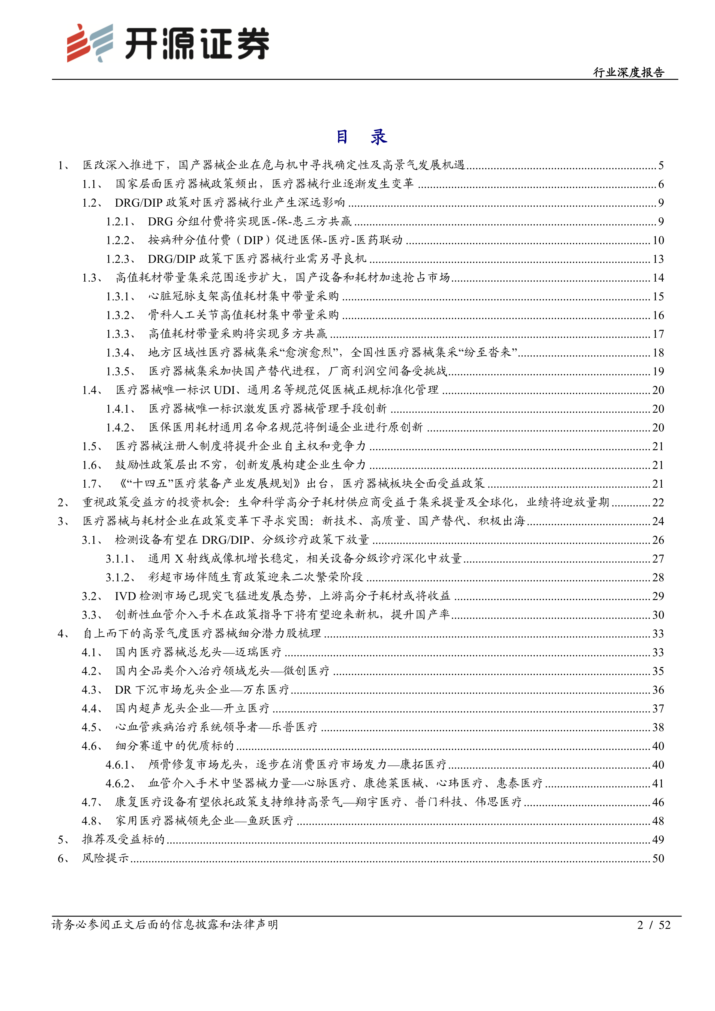 本报告的核心观点是:中国医疗器械行业在医改深入推进、政策频出的大背景下,面临着挑战与机遇并存的局面。一方面,DRG/DIP付费制度和高值耗材带量集采政策对医疗器械企业利润空间造成短期压力;另一方面,这些政策也促进了国产替代,并为创新产品和技术提供了新的市场空间。报告建议投资者关注集采政策受益方以及具备国产替代和全球化能力的医疗器械企业。