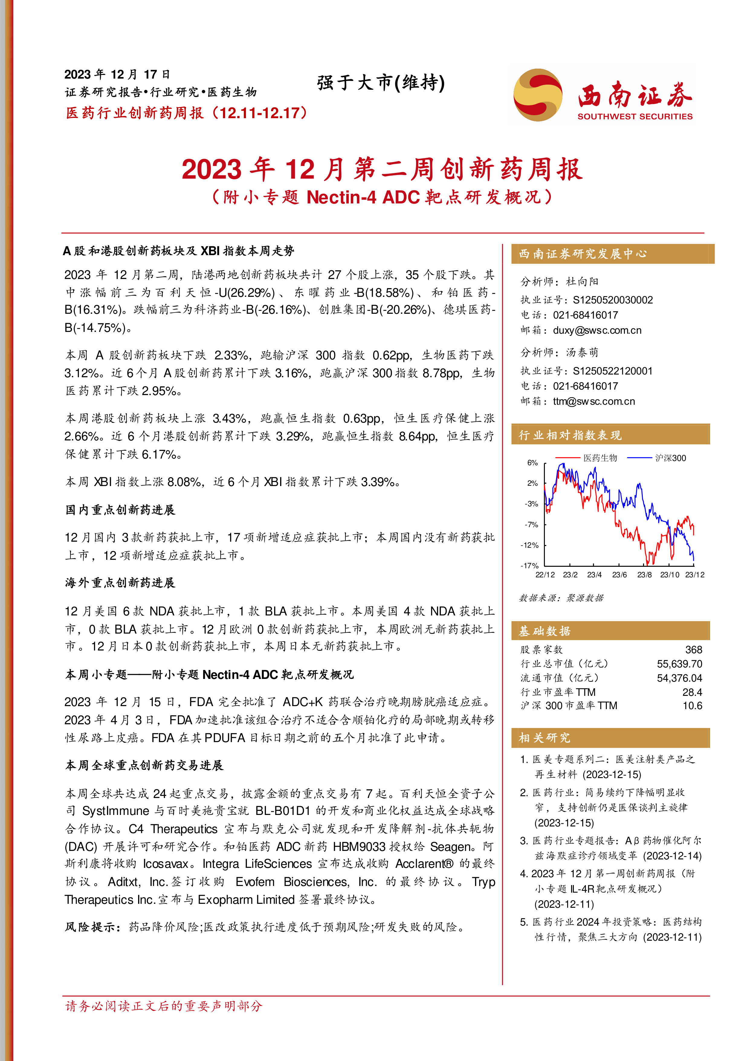 医药行业创新药周报:2023年12月第二周创新药周报(附小专题Nectin-4 ADC靶点研发概况)