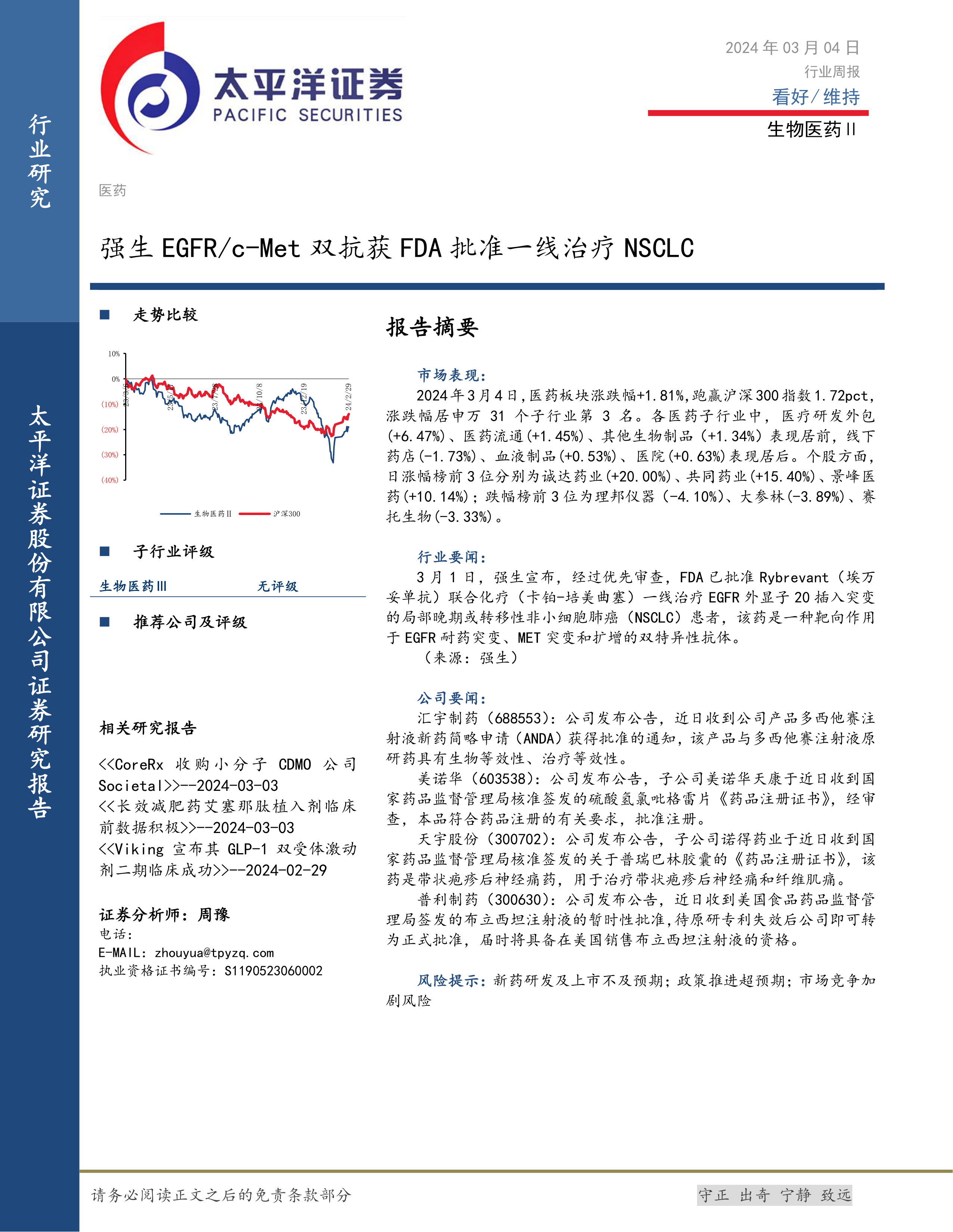 本报告分析了2024年3月1日生物医药Ⅱ行业市场表现,指出行业整体向好,但个股表现分化明显。强生EGFR/c-Met双抗获批是行业的重要利好消息,为NSCLC治疗带来了新的希望。同时,多家公司在药品注册和新药研发方面取得进展,展现了行业发展活力。然而,投资者仍需关注市场风险,谨慎投资,选择具有长期发展潜力的公司。 未来行业发展仍需关注新药研发进展、政策变化以及市场竞争等因素。
