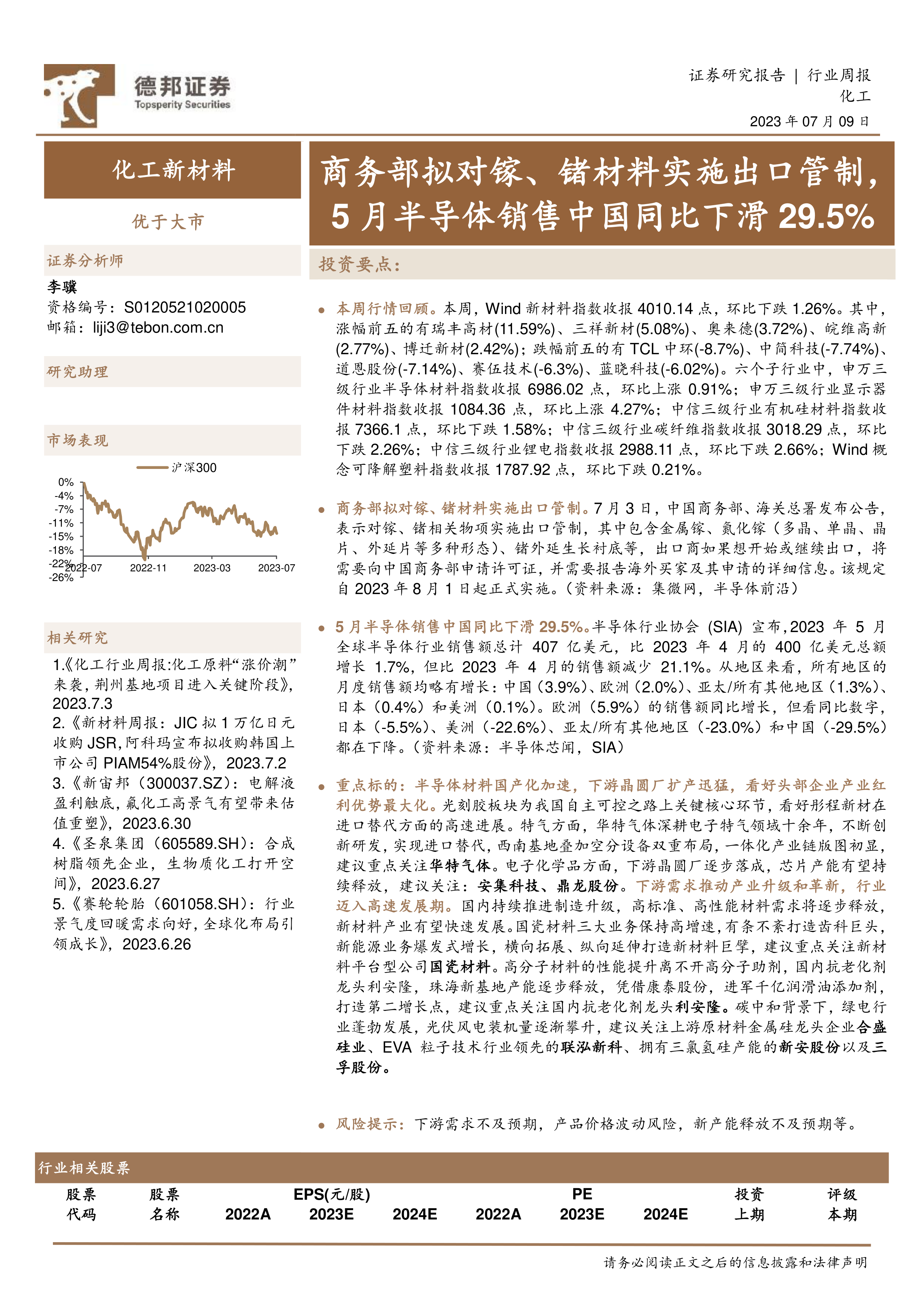 化工新材料行业周报:商务部拟对镓、锗材料实施出口管制,5月半导体销售中国同比下滑29.5%