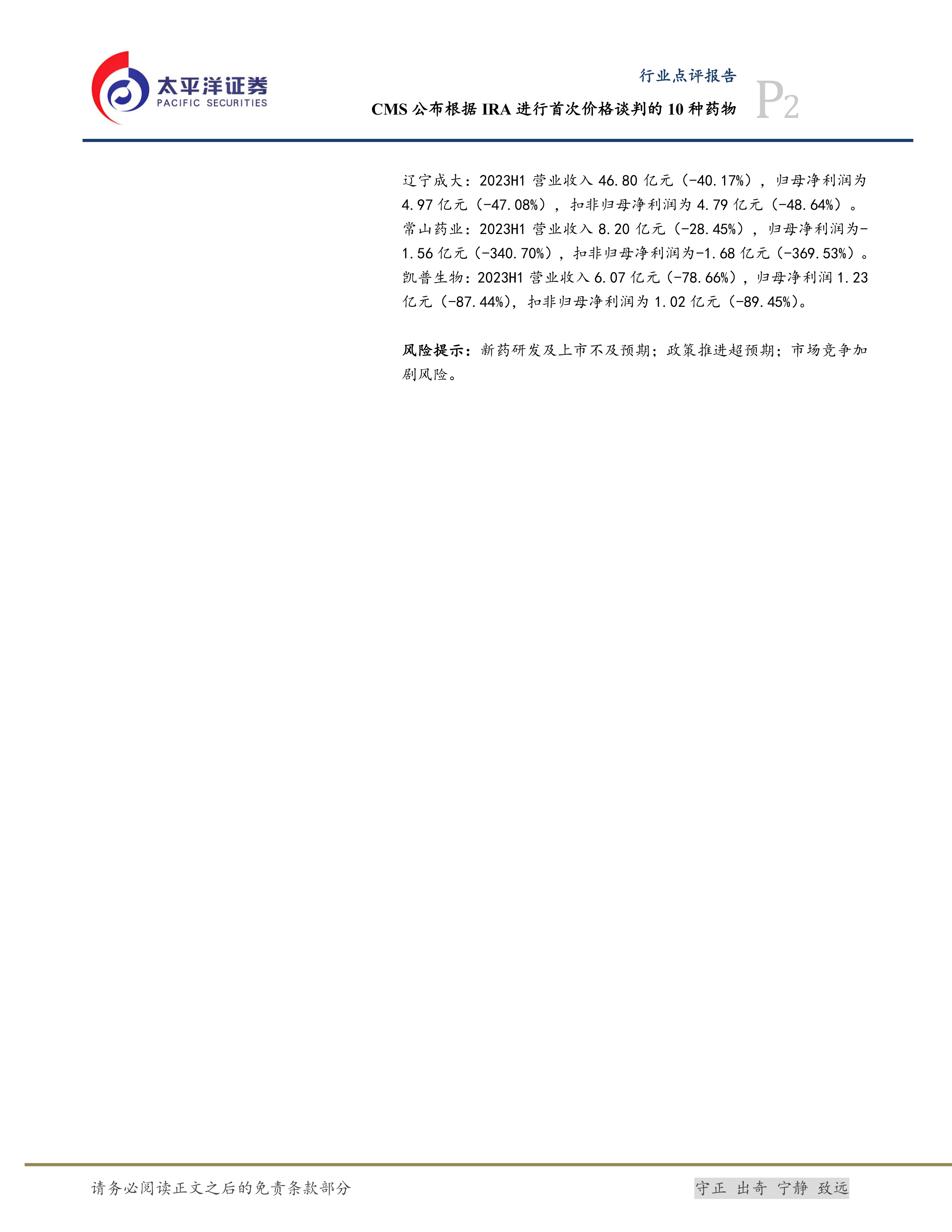 报告提到了CMS公布的药物价格谈判清单这一重要行业事件,并对该事件可能带来的影响进行了初步分析。 此外,报告还指出了新药研发及上市不及预期、政策推进超预期以及市场竞争加剧等潜在风险,提醒投资者注意投资风险。
