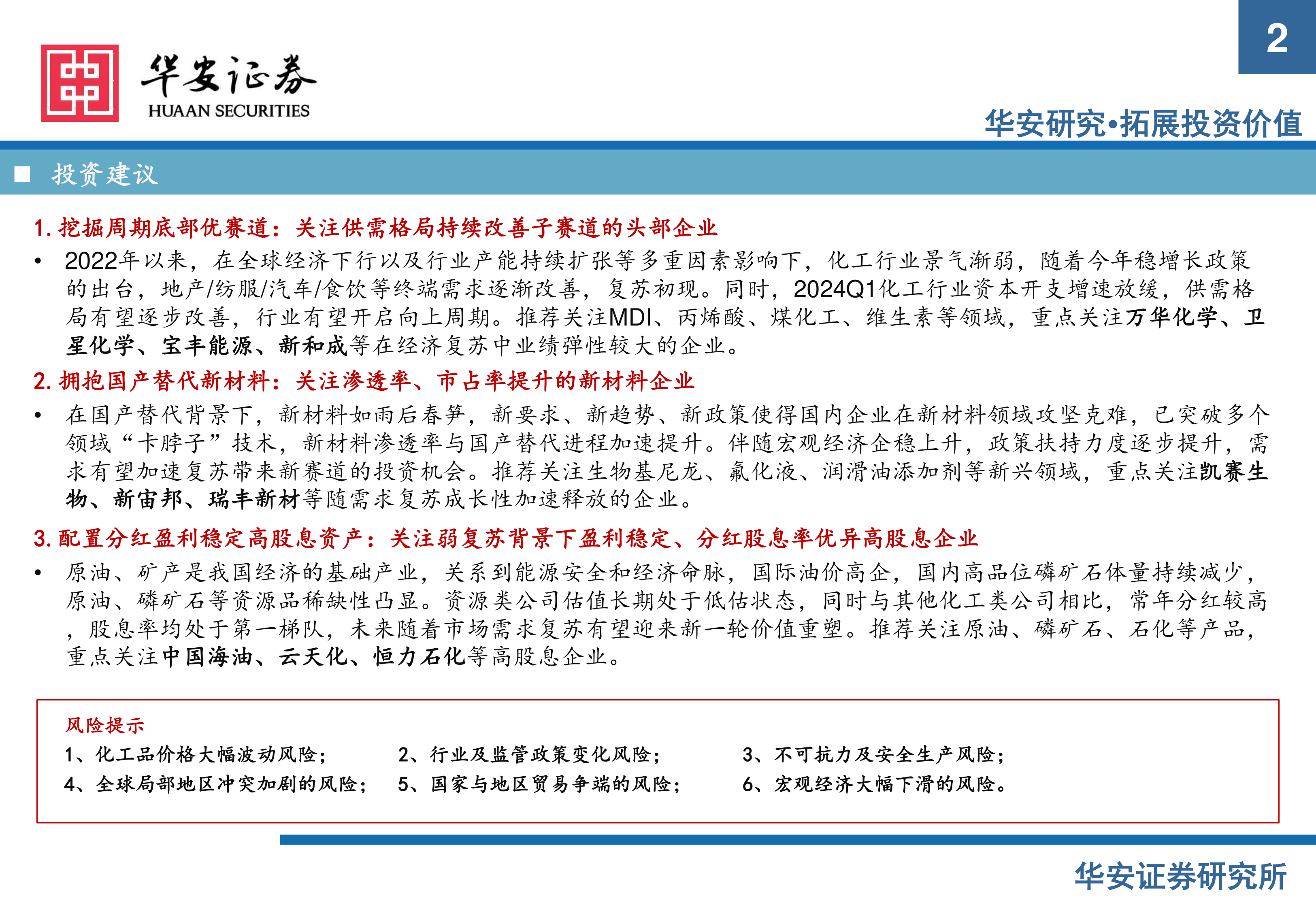 报告最后给出了具体的投资建议,并列出了化工行业投资可能面临的风险,包括化工品价格大幅波动风险、行业及监管政策变化风险、不可抗力及安全生产风险、地缘政治风险、贸易摩擦风险以及宏观经济下滑风险等。