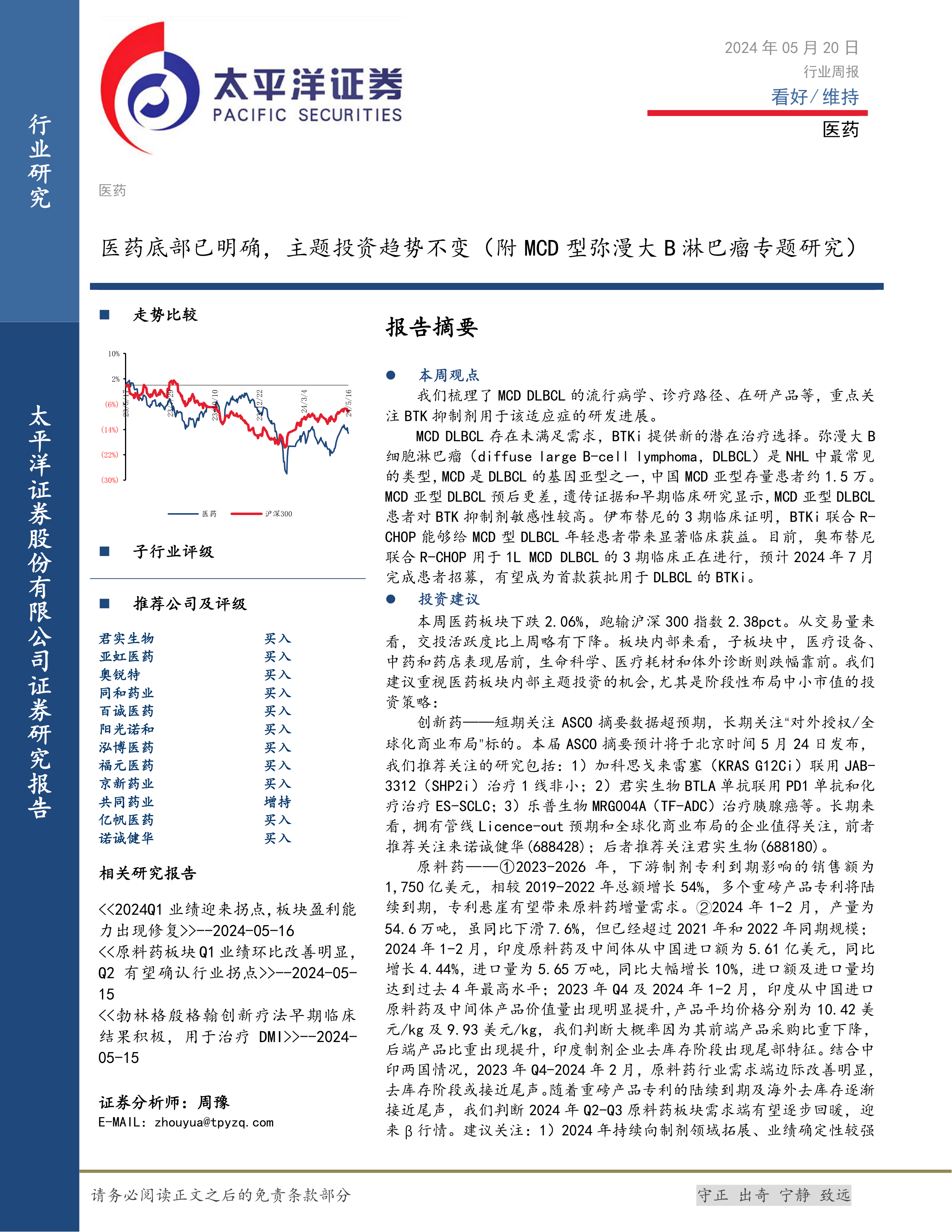 医药行业周报:医药底部已明确,主题投资趋势不变(附MCD型弥漫大B淋巴瘤专题研究)