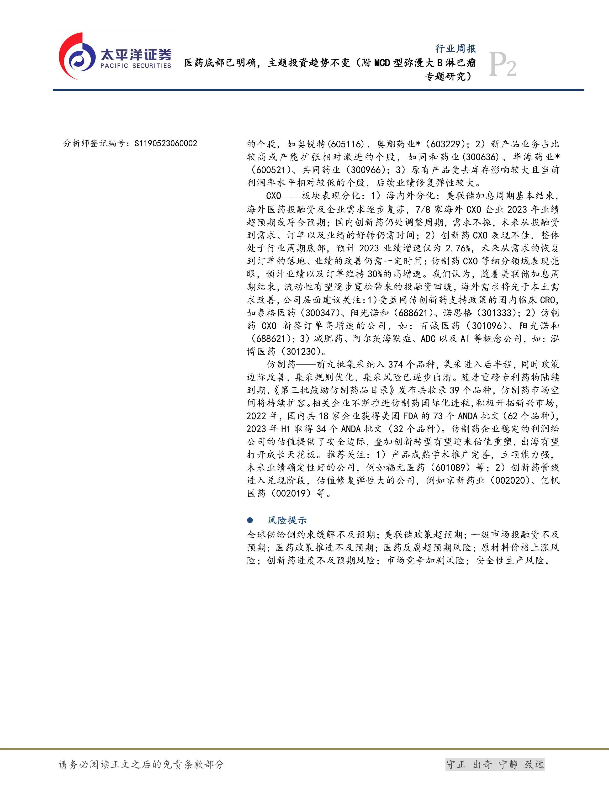 CXO——板块表现分化:1)海内外分化:美联储加息周期基本结束,海外医药投融资及企业需求逐步复苏,7/8家海外CXO企业2023年业绩超预期或符合预期;国内创新药仍处调整周期,需求不振,未来从投融资到需求、订单以及业绩的好转仍需时间;2)创新药CXO表现不佳,整体处于行业周期底部,预计2023业绩增速仅为2.76%,未来从需求的恢复到订单的落地、业绩的改善仍需一定时间;仿制药CXO等细分领域表现亮眼,预计业绩以及订单维持30%的高增速。我们认为,随着美联储加息周期结束,流动性有望逐步宽松带来的投融资回暖,海外需求将先于本土需求改善,公司层面建议关注:1)受益网传创新药支持政策的国内临床CRO,如泰格医药(300347)、阳光诺和(688621)、诺思格(301333);2)仿制药CXO新签订单高增速的公司,如:百诚医药(301096)、阳光诺和(688621);3)减肥药、阿尔茨海默症、ADC以及AI等概念公司,如:泓博医药(301230)。