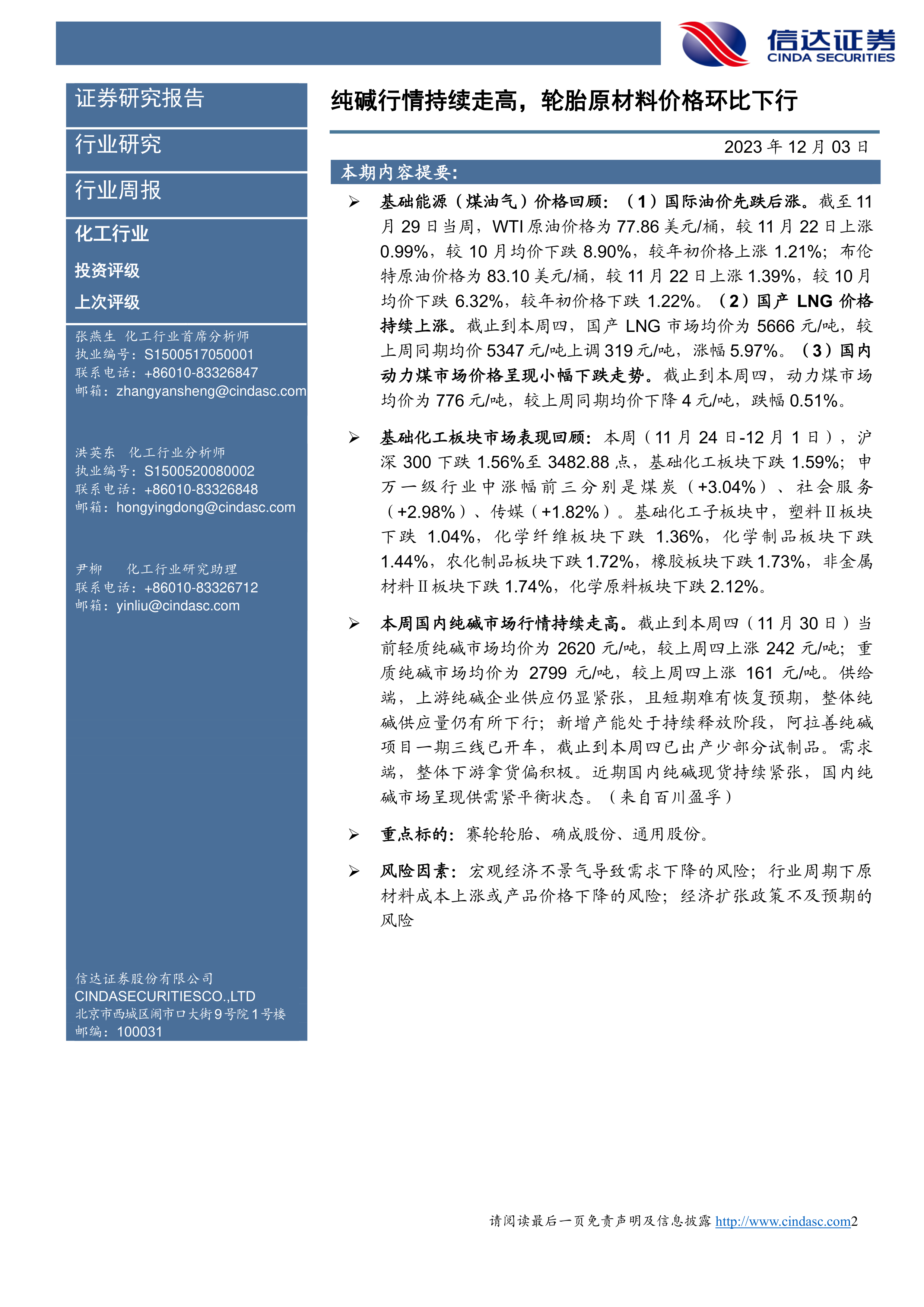 化工行业周报:纯碱行情持续走高,轮胎原材料价格环比下行