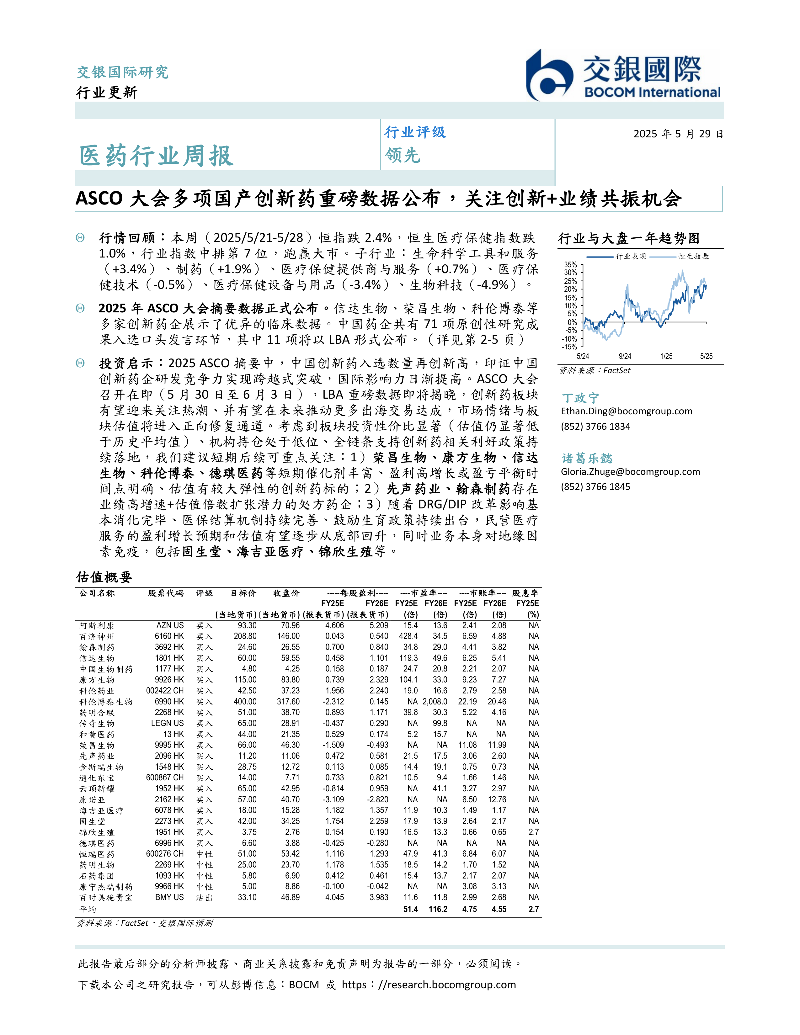 2025年ASCO大会上中国创新药企的出色表现,以及多家药企在研发和市场拓展方面的积极进展,为医药行业带来了新的增长动力。 结合行业估值水平和政策利好,报告建议投资者关注创新药、处方药和民营医疗服务等领域的投资机会,并重点关注报告中提到的具有高增长潜力和短期催化剂的个股。 然而,投资者仍需谨慎评估风险,并进行独立的投资决策。