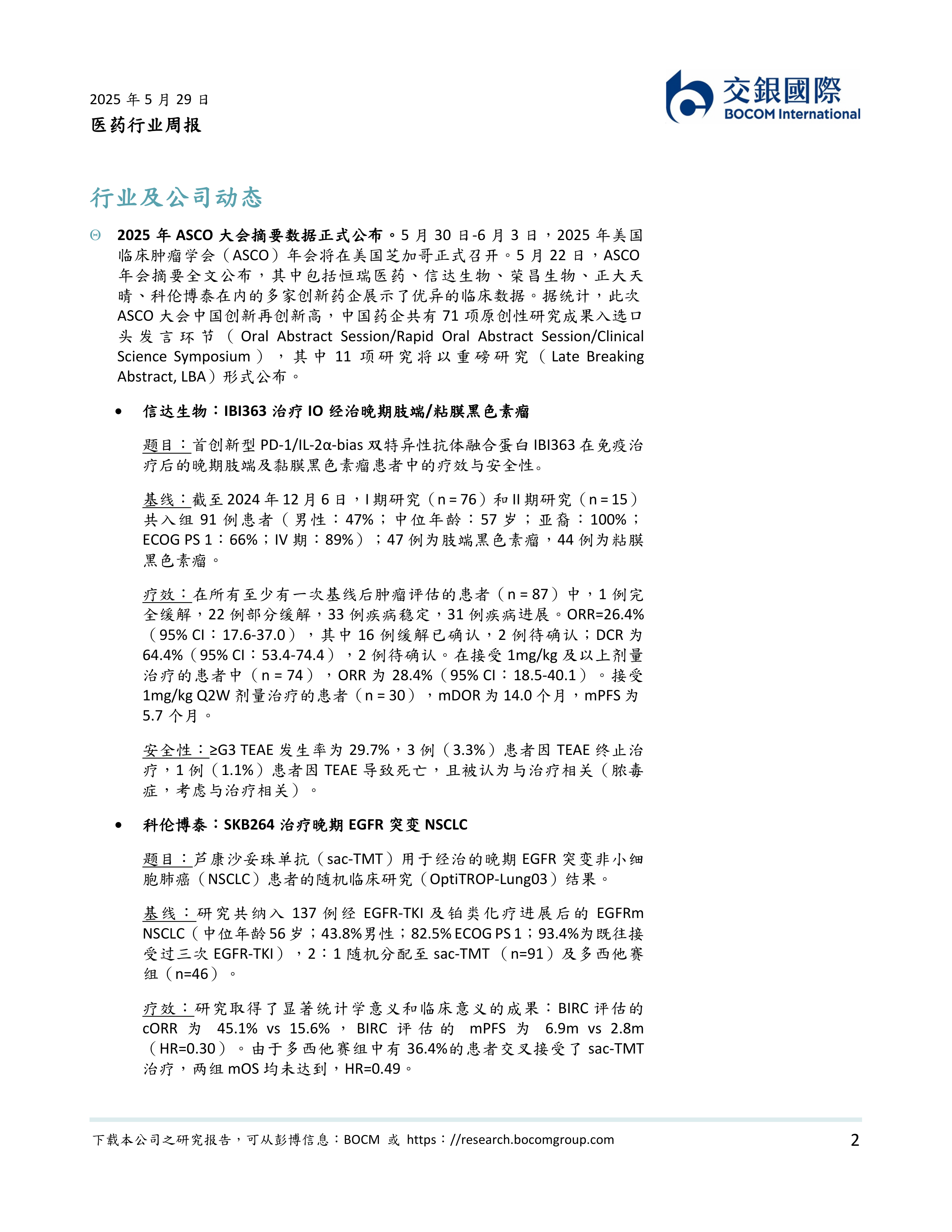 2025年ASCO大会摘要数据正式公布。信达生物、荣昌生物、科伦博泰等多家创新药企展示了优异的临床数据。中国药企共有71项原创性研究成果入选口头发言环节,其中11项将以LBA形式公布。(详见第2-5页)