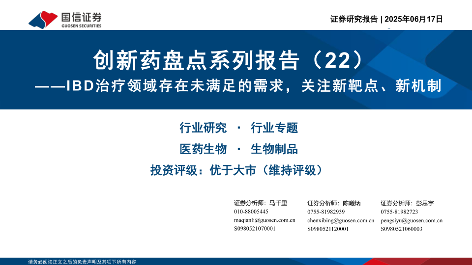 创新药盘点系列报告(22):IBD治疗领域存在未满足的需求,关注新靶点、新机制