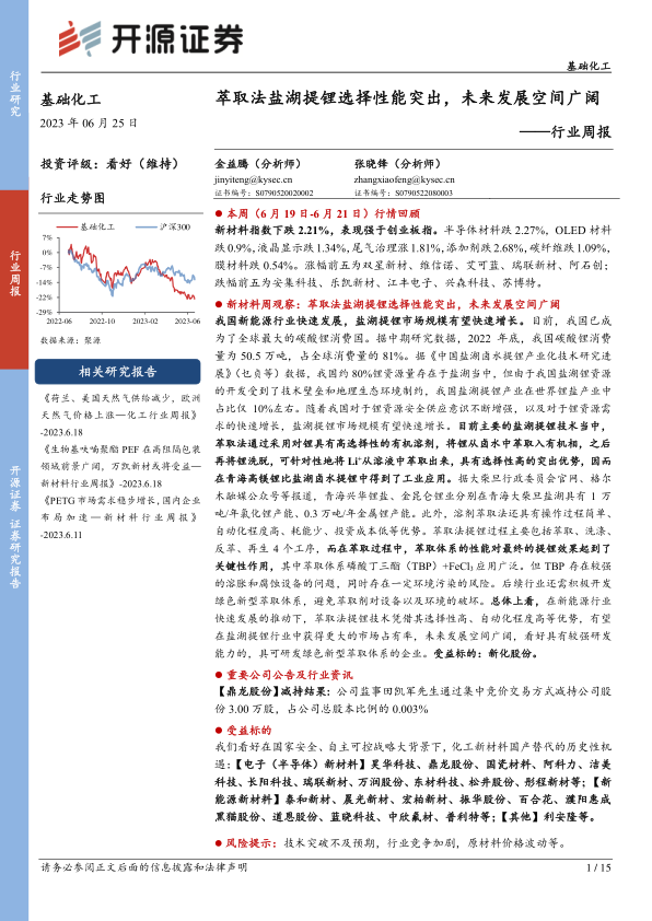基础化工行业周报:萃取法盐湖提锂选择性能突出,未来发展空间广阔