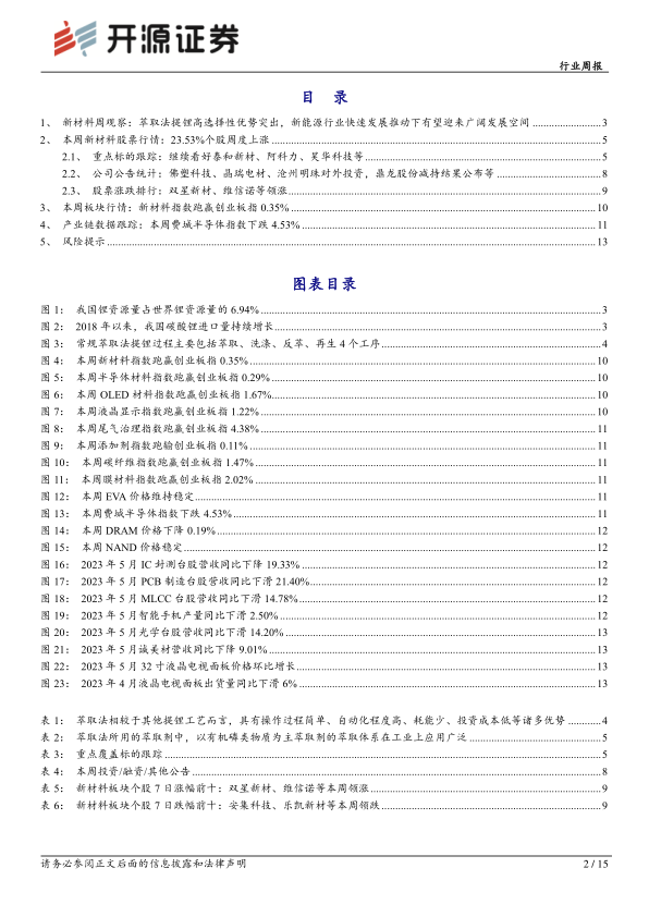 本报告基于公开数据,对我国盐湖提锂市场及萃取法提锂技术进行了分析。报告认为,新能源行业的高速发展将驱动盐湖提锂市场快速增长,而萃取法提锂技术凭借其高选择性和自动化程度高等优势,有望在未来占据更大的市场份额。报告推荐关注具有较强研发能力,能够开发绿色新型萃取体系的企业,并提示了相关投资风险。 报告中对重点新材料个股和板块行情进行了详细分析,并提供了产业链数据跟踪,为投资者提供参考。