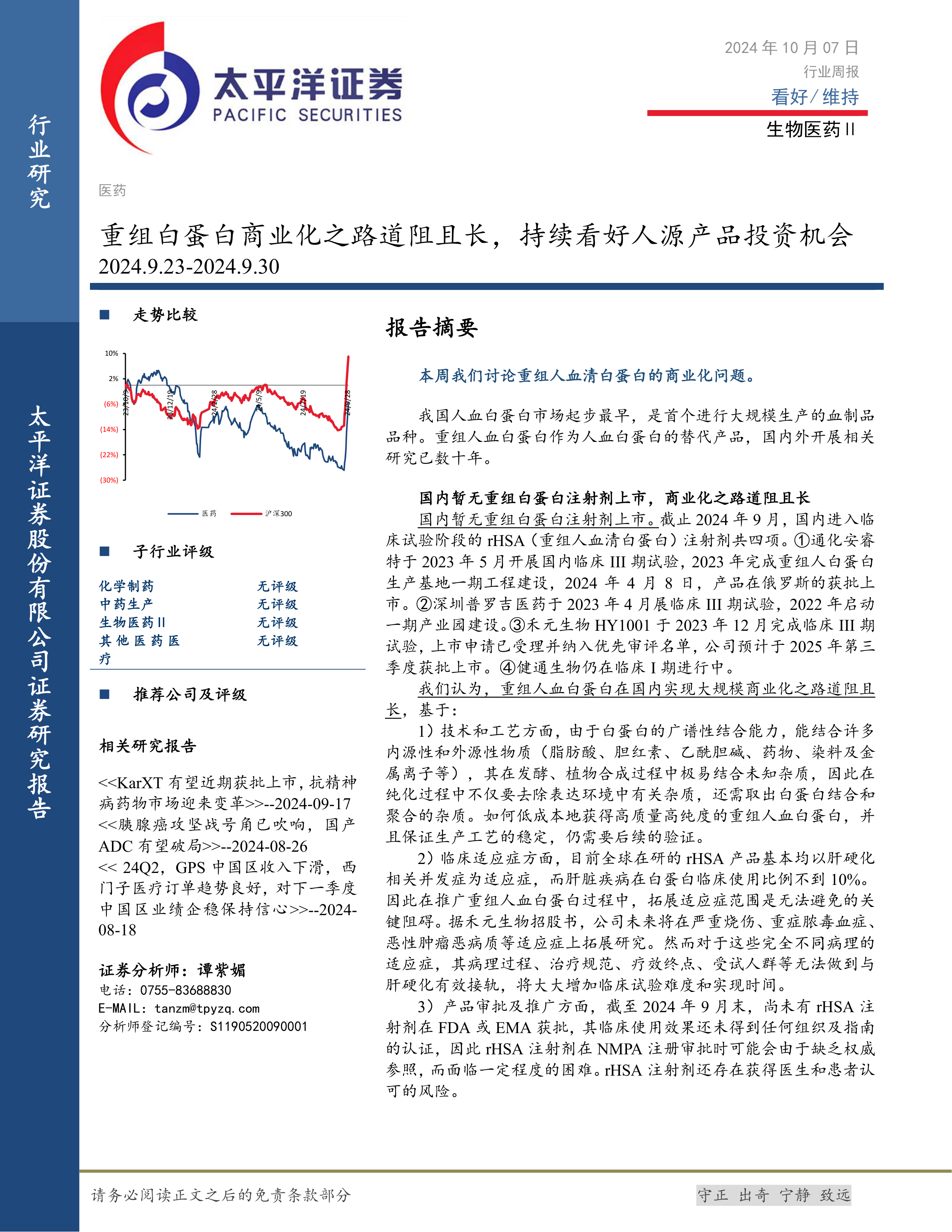 生物医药Ⅱ行业周报:重组白蛋白商业化之路道阻且长,持续看好人源产品投资机会