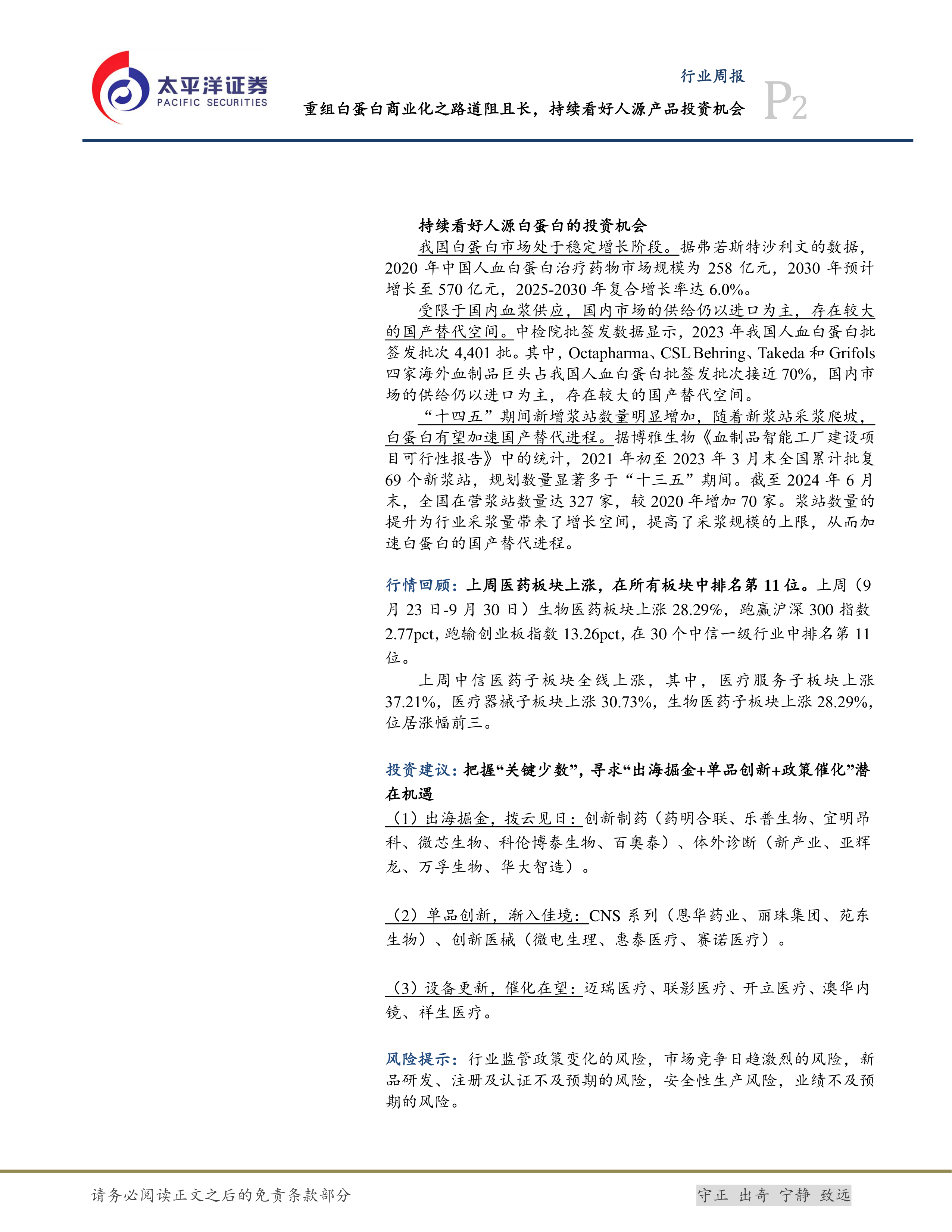 3)产品审批及推广方面,截至2024年9月末,尚未有rHSA注射剂在FDA或EMA获批,其临床使用效果还未得到任何组织及指南的认证,因此rHSA注射剂在NMPA注册审批时可能会由于缺乏权威参照,而面临一定程度的困难。rHSA注射剂还存在获得医生和患者认可的风险。