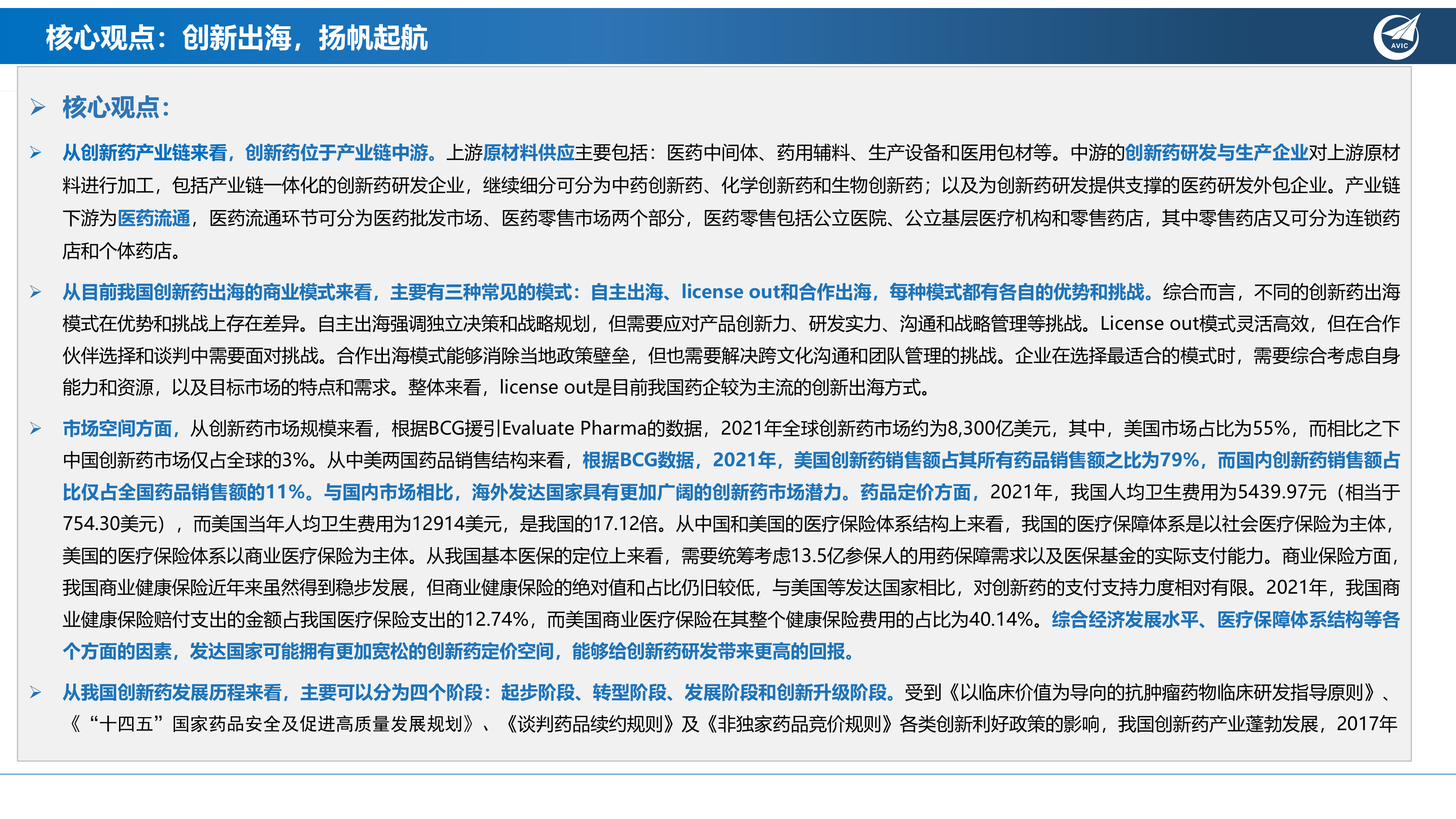 中国创新药产业正处于快速发展阶段,但与发达国家相比仍存在差距。出海是提升企业竞争力、拓展市场空间的关键战略,但同时也面临着研发实力、市场准入、政策法规等方面的挑战。机遇在于海外市场广阔,发达国家拥有更宽松的定价空间,以及中国创新药研发能力的不断提升。