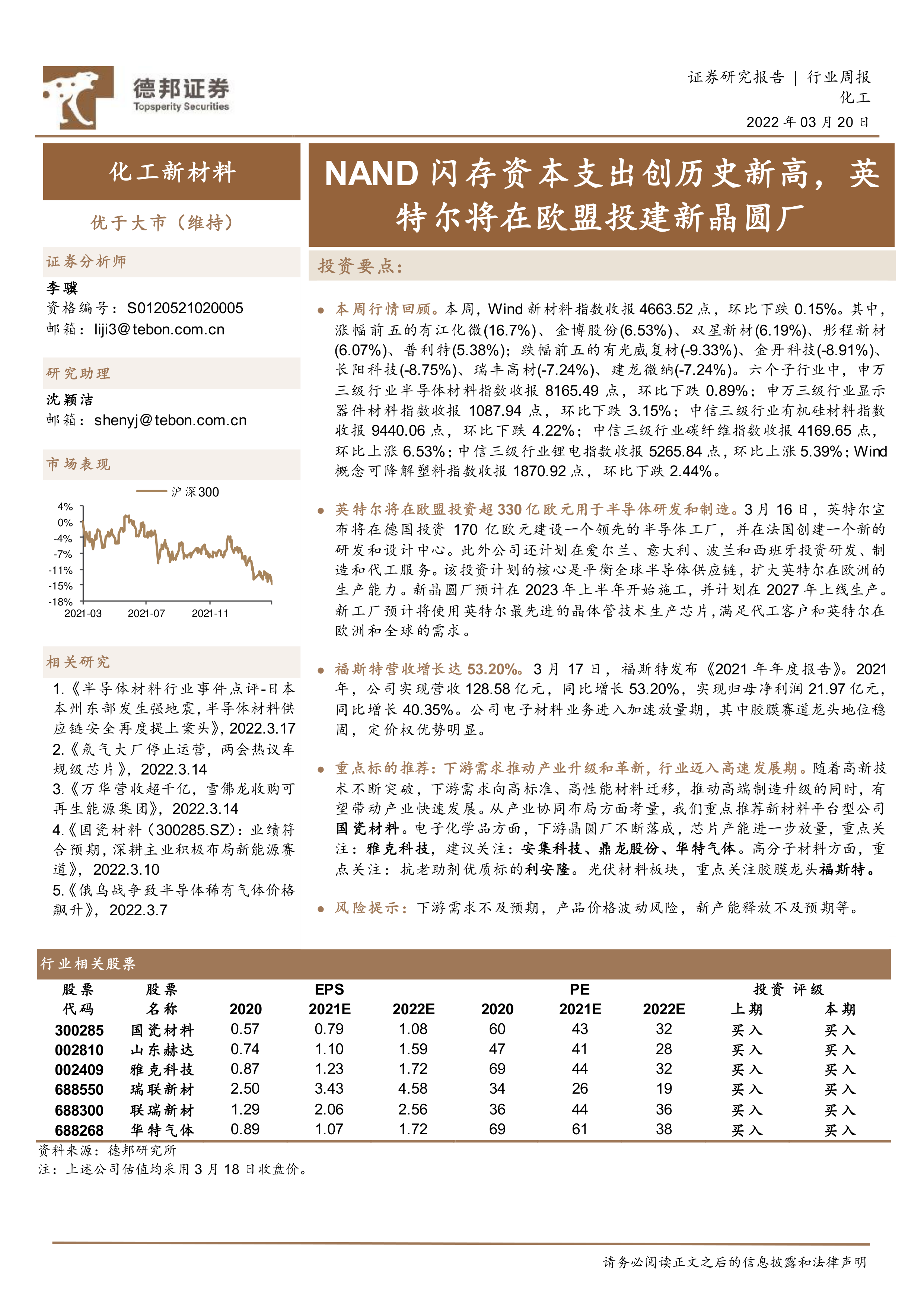 化工新材料行业周报:NAND闪存资本支出创历史新高,英特尔将在欧盟投建新晶圆厂