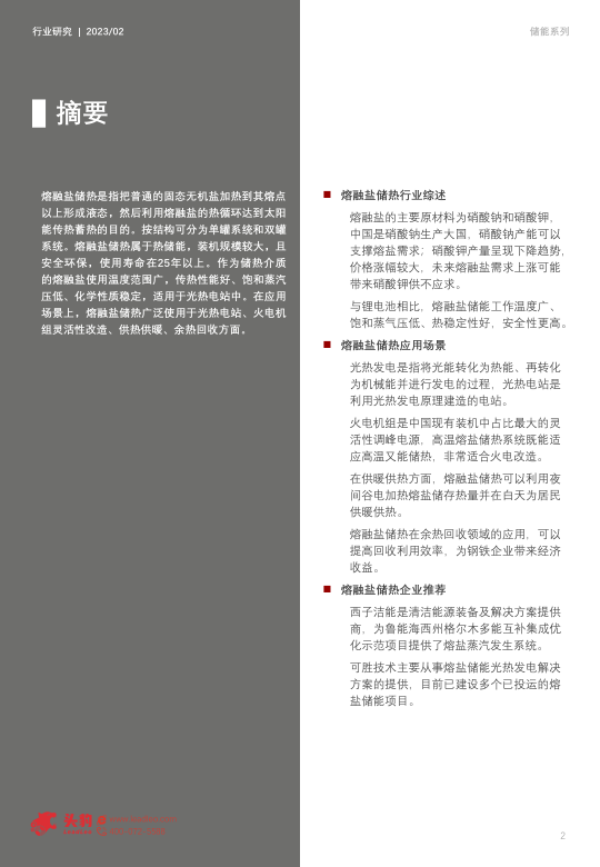 本报告的核心观点是:中国熔融盐储热行业正处于发展初期,市场潜力巨大,主要应用于光热发电、火电机组灵活性改造、供热供暖和余热回收等领域。虽然硝酸钾原材料价格上涨可能带来挑战,但熔融盐储热技术的高安全性、长寿命和环保性使其具有显著优势,未来发展前景广阔。